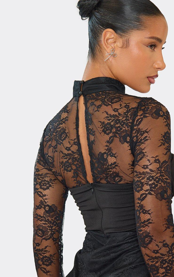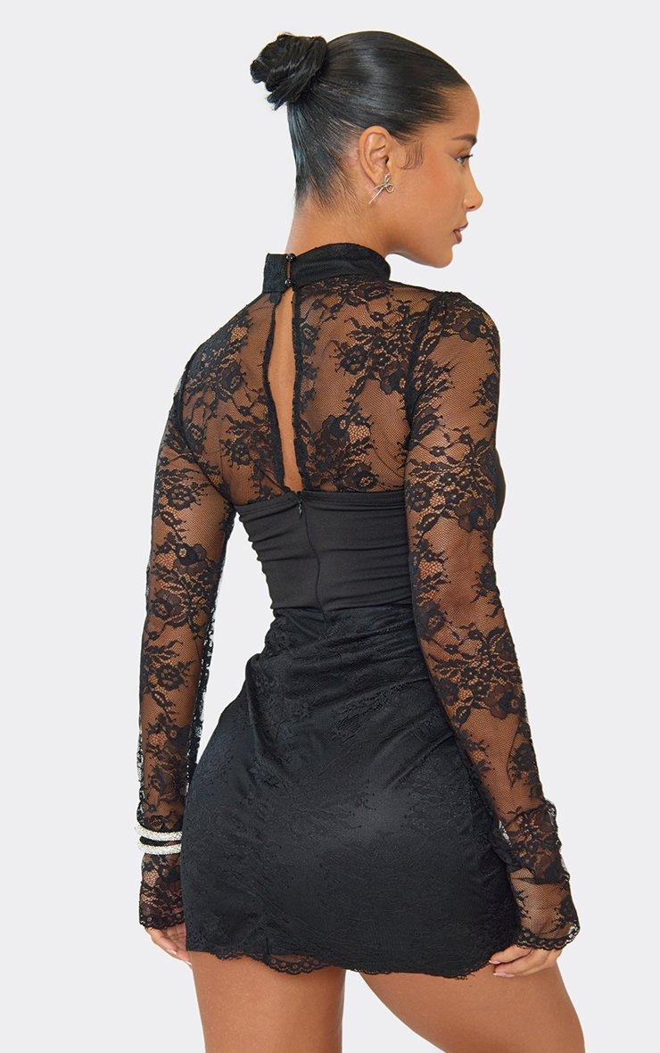 High Neck Long Sleeve Lace Detail Corset Overlay Mini Dress In Black