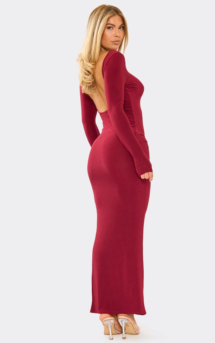 Long Sleeve Ruched Trim Detail Maxi Dress In Burgundy Slinky