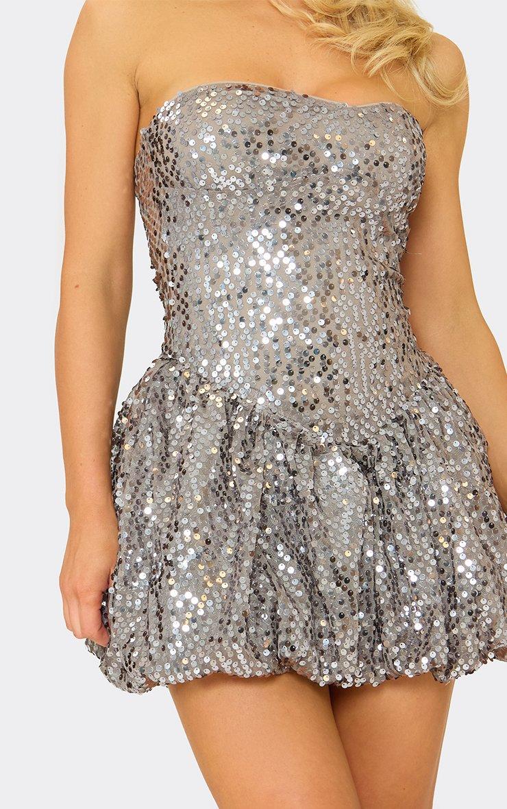 Bandeau Puffball Detail Mini Dress In Taupe Sequin