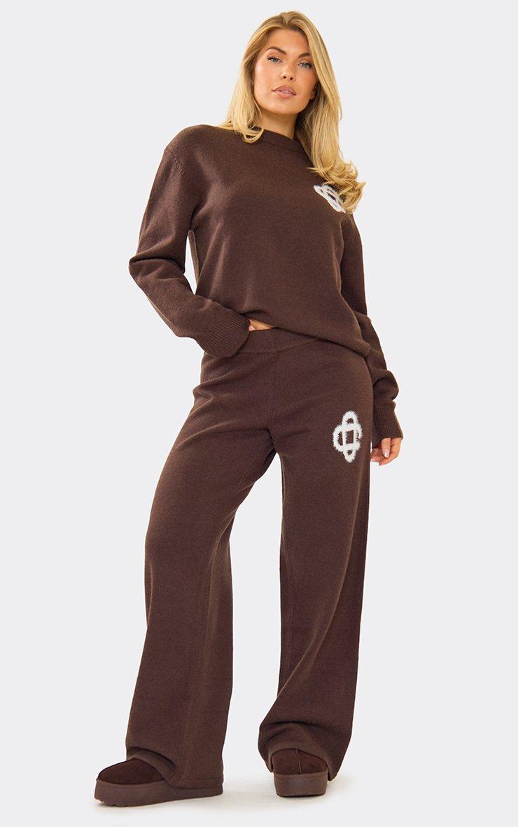 High Waist Embroidered Ego Logo Detail Wide Leg Trousers In Chocolate Brown Knit