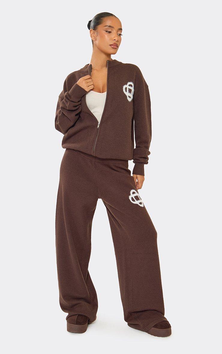 High Waist Embroidered Ego Logo Detail Wide Leg Trousers In Chocolate Brown Knit