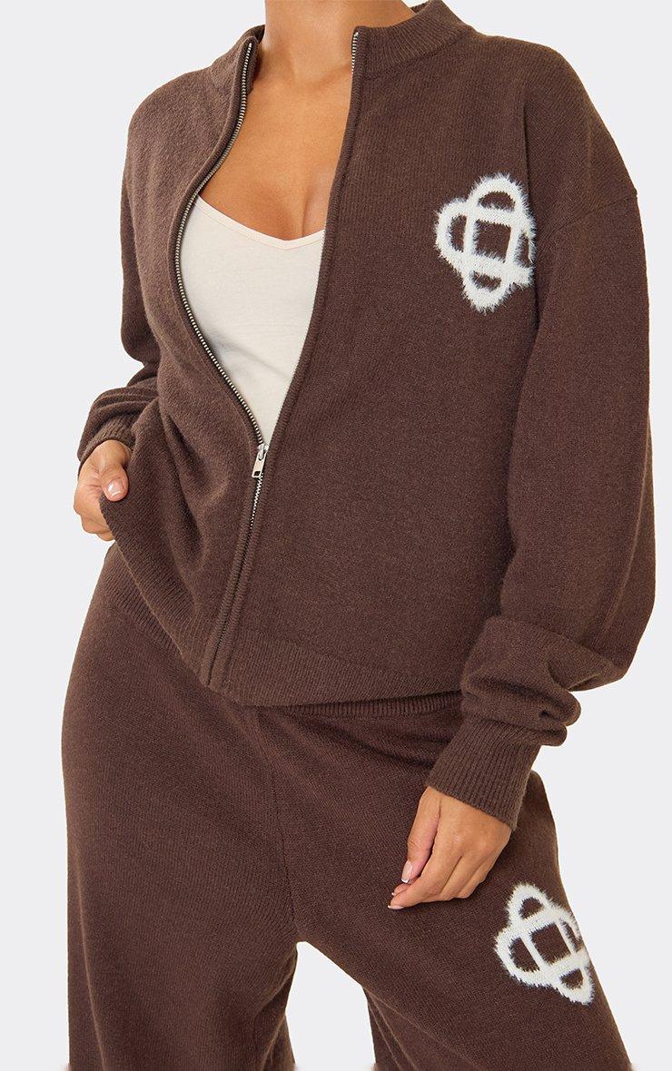 High Neck Contrast Fluffy Swirl Detail Zip Up Cardigan In Chocolate Brown Knit