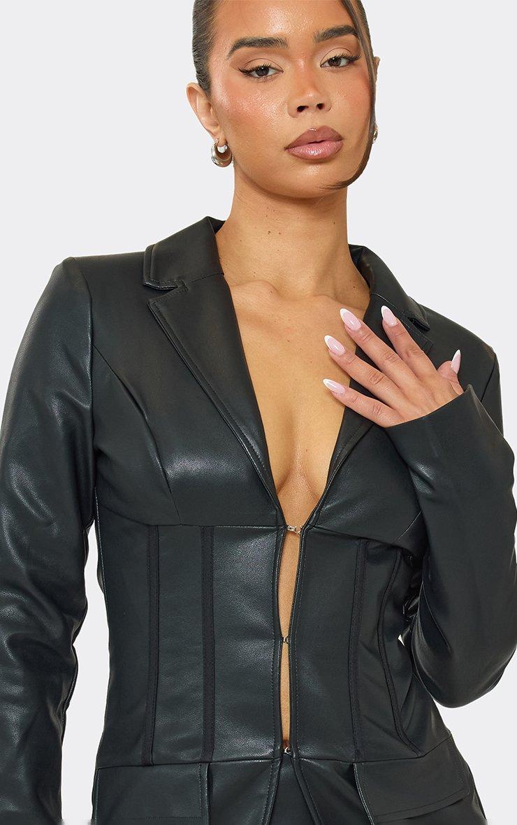 Hook And Eye Cinched Waist Blazer Top In Black Faux Leather