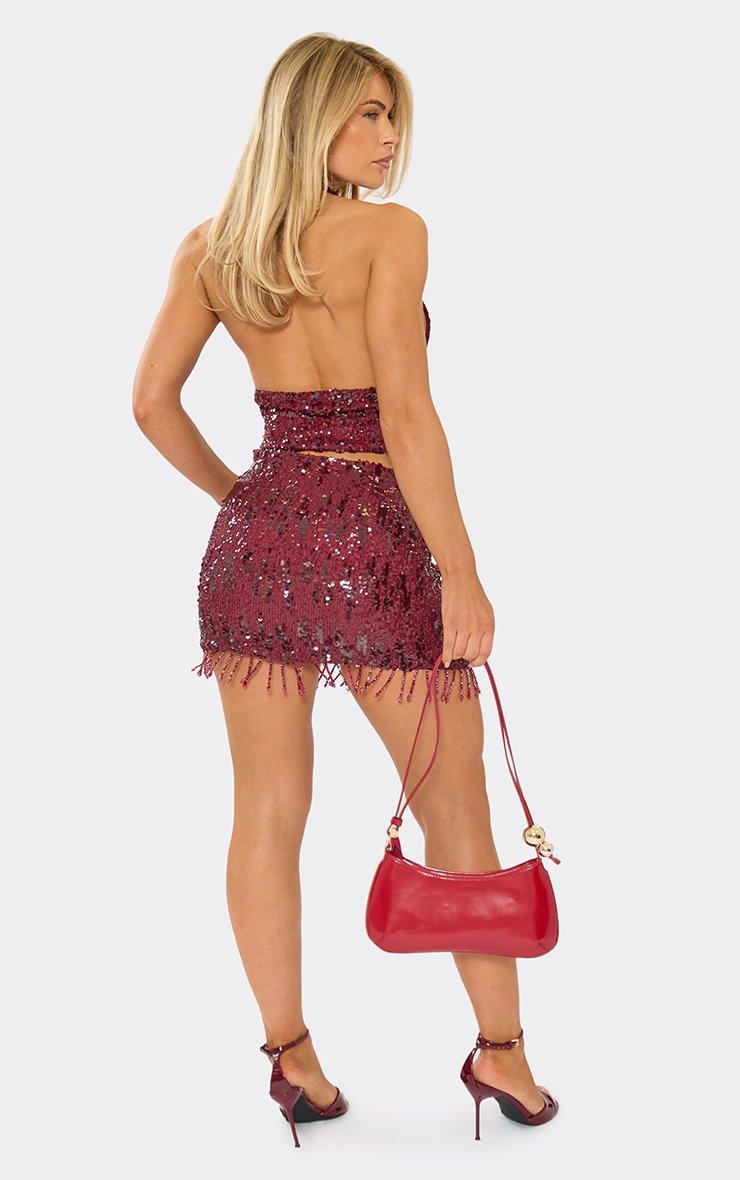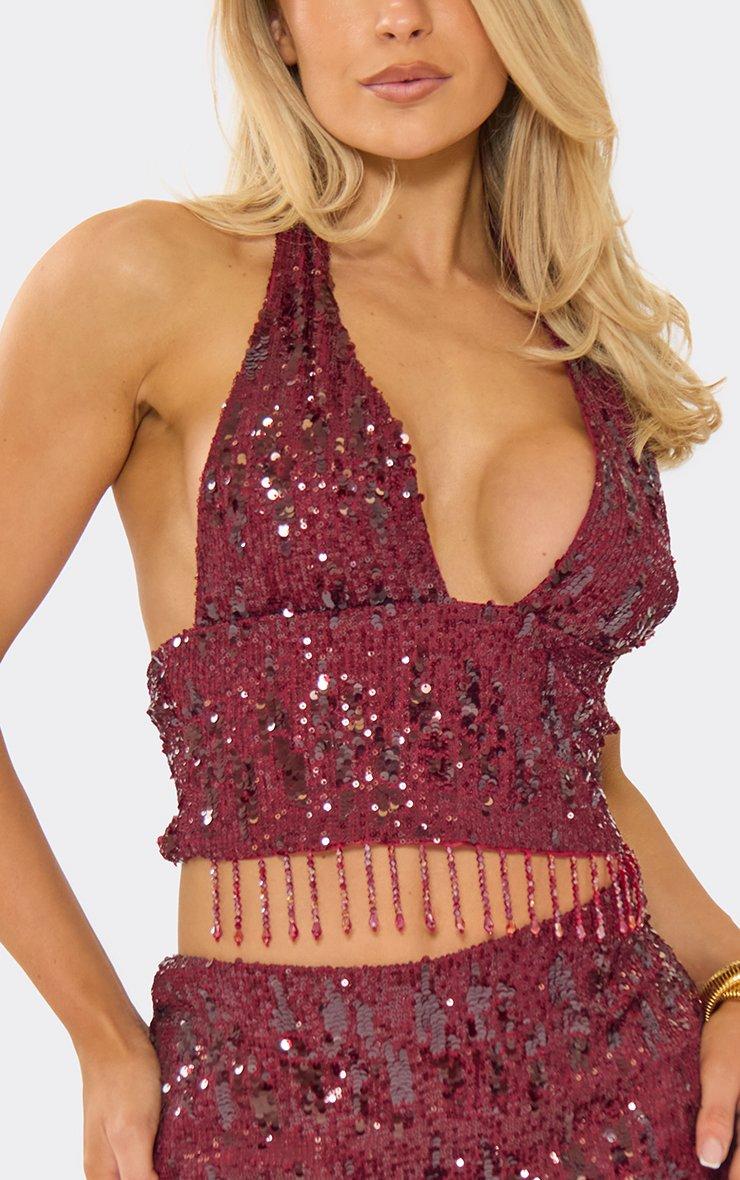 halterneck embroidered bead trim detail crop top in burgundy sequin