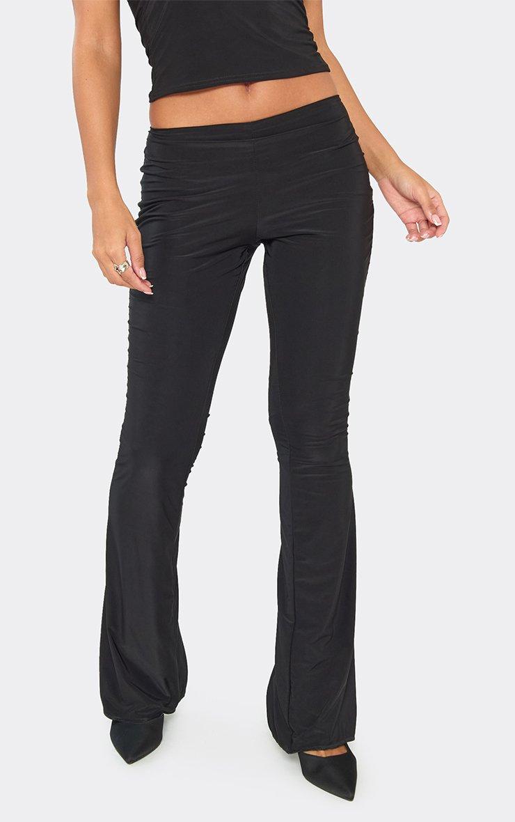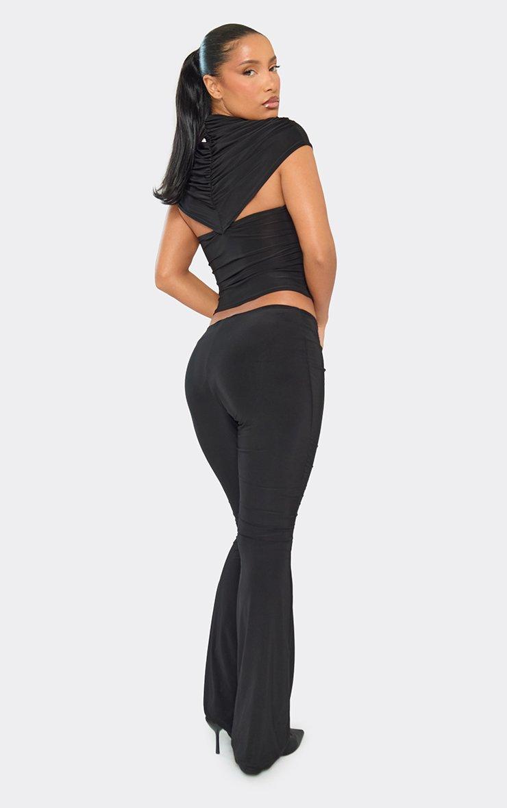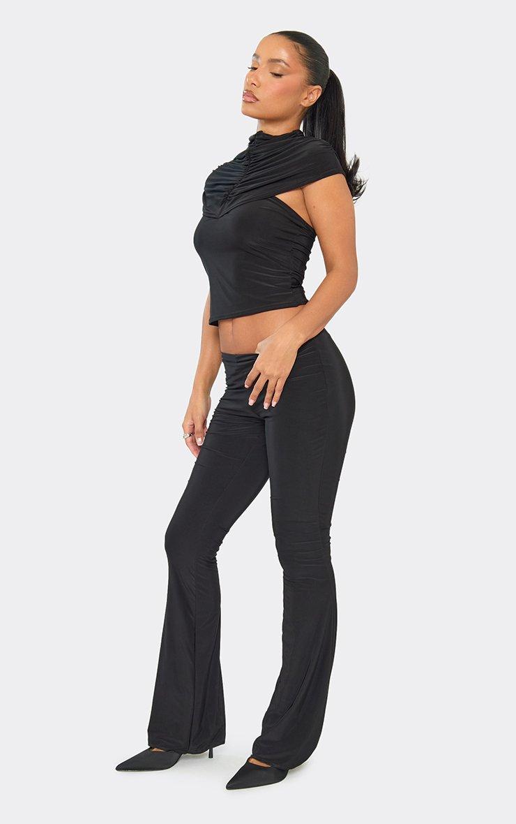 Mid Rise Belt Detail Wide Leg Trousers In Black Woven
