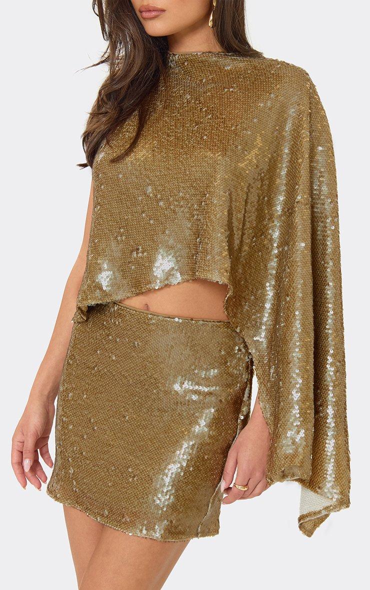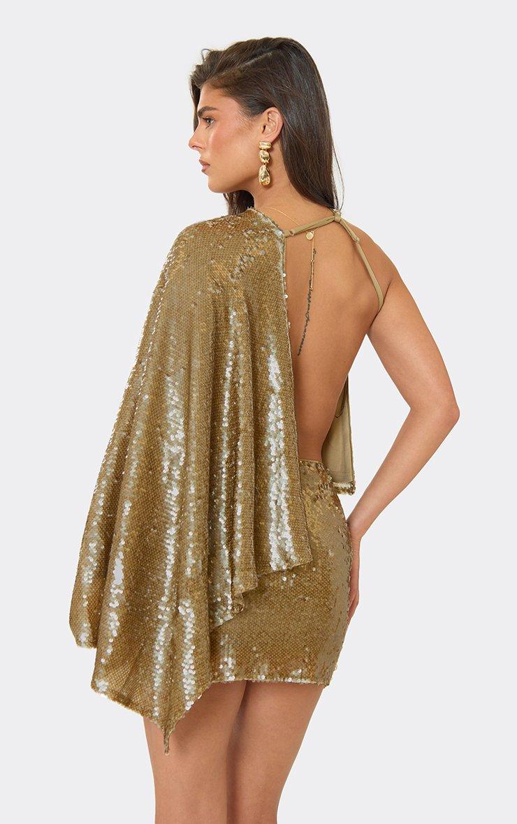 Asymmetric Cape Backless Detail Top In Gold Sequin