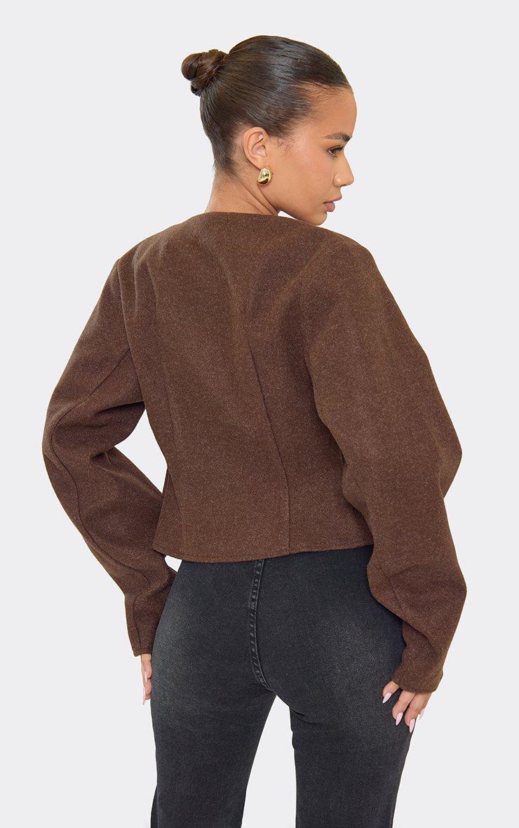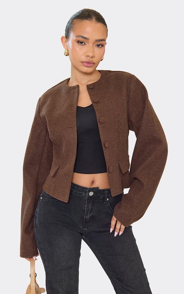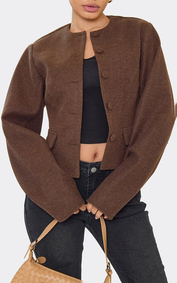 Crew Neck Button Front Wool Look Cinched Blazer In Chocolate Brown