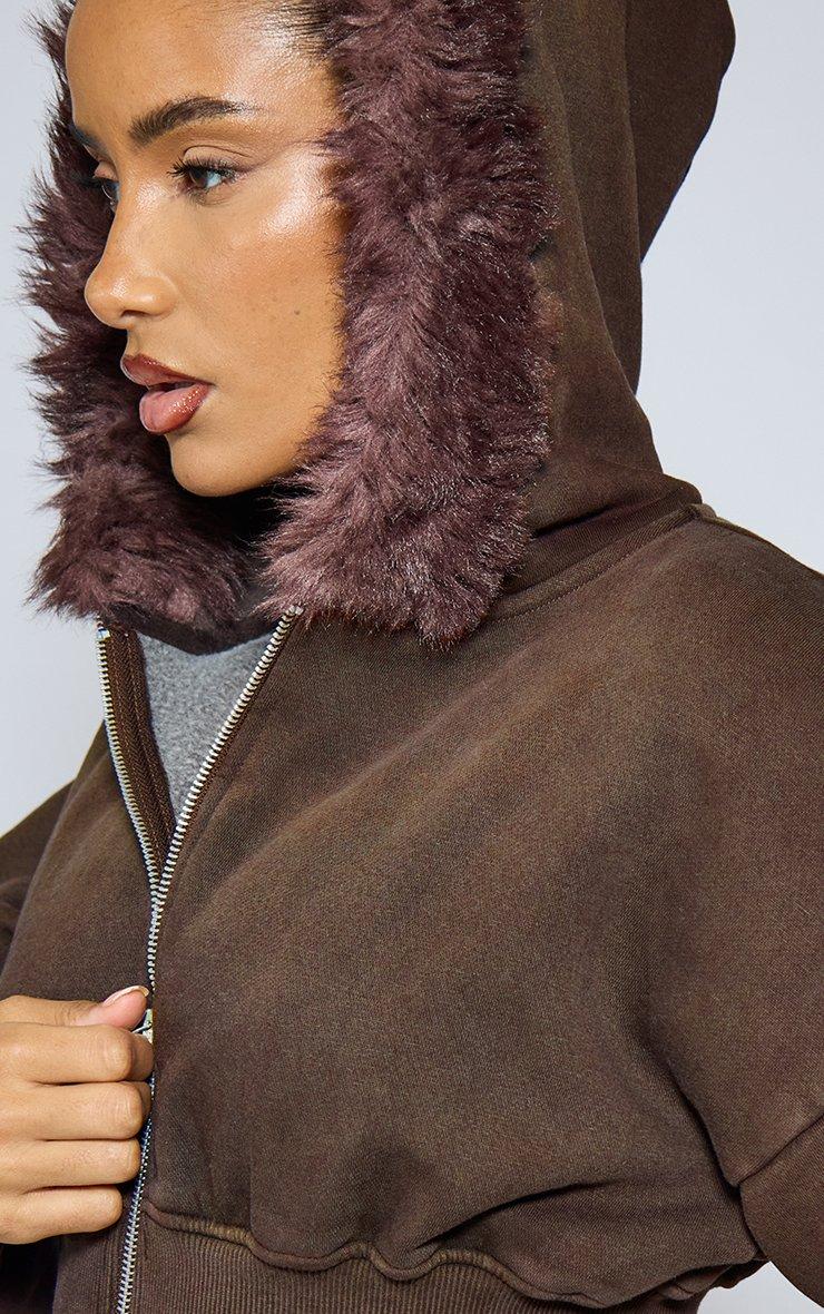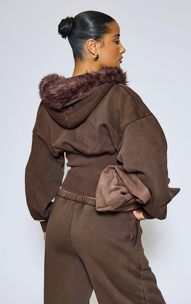 fur detail cinched waist zip up hoodie in washed chocolate brown