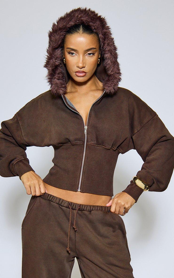 Fur Detail Cinched Waist Zip Up Hoodie In Washed Chocolate Brown