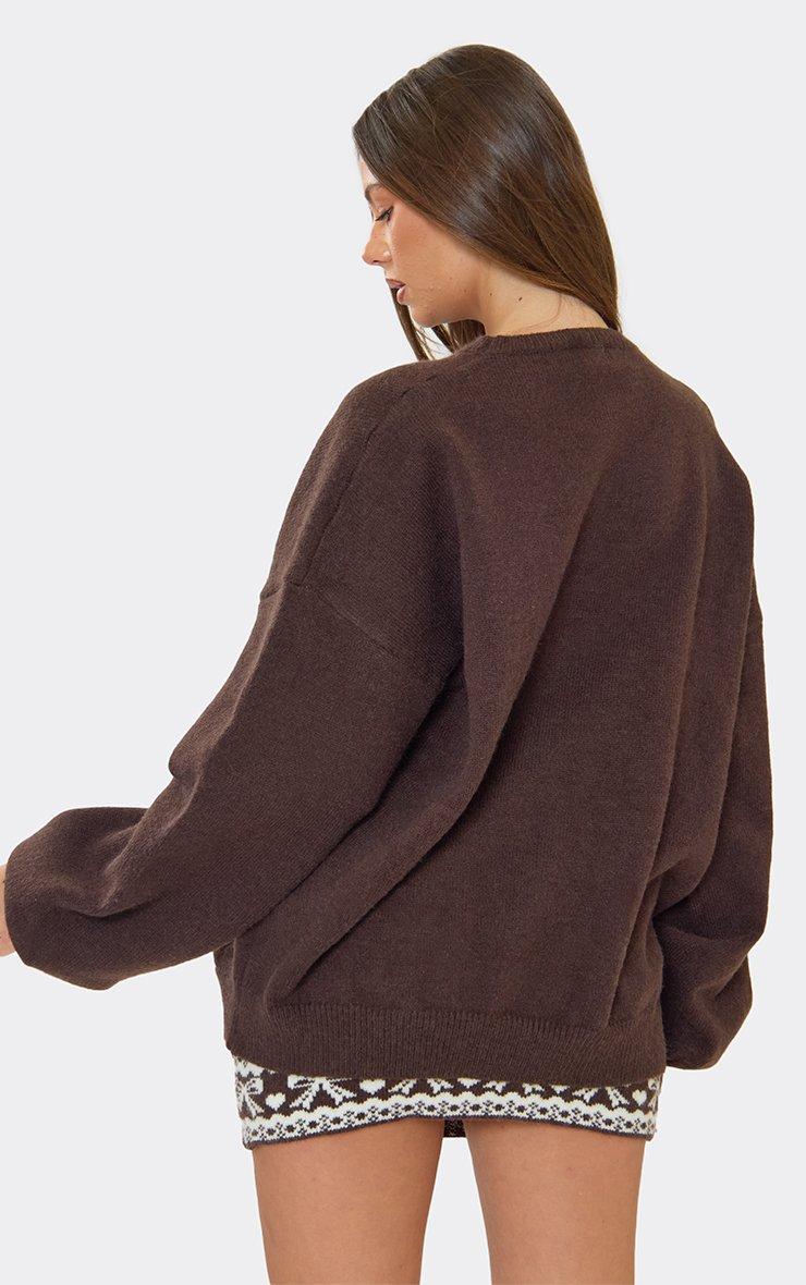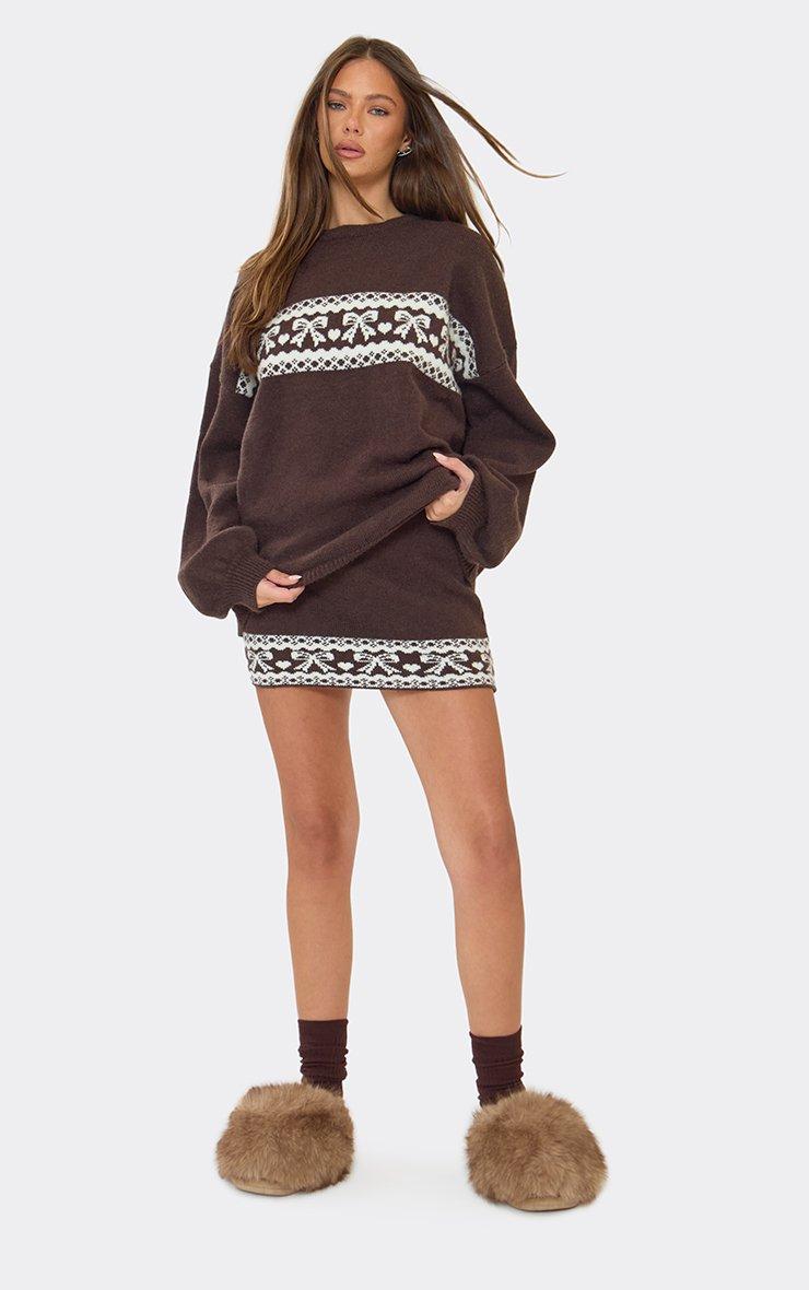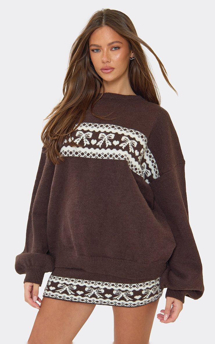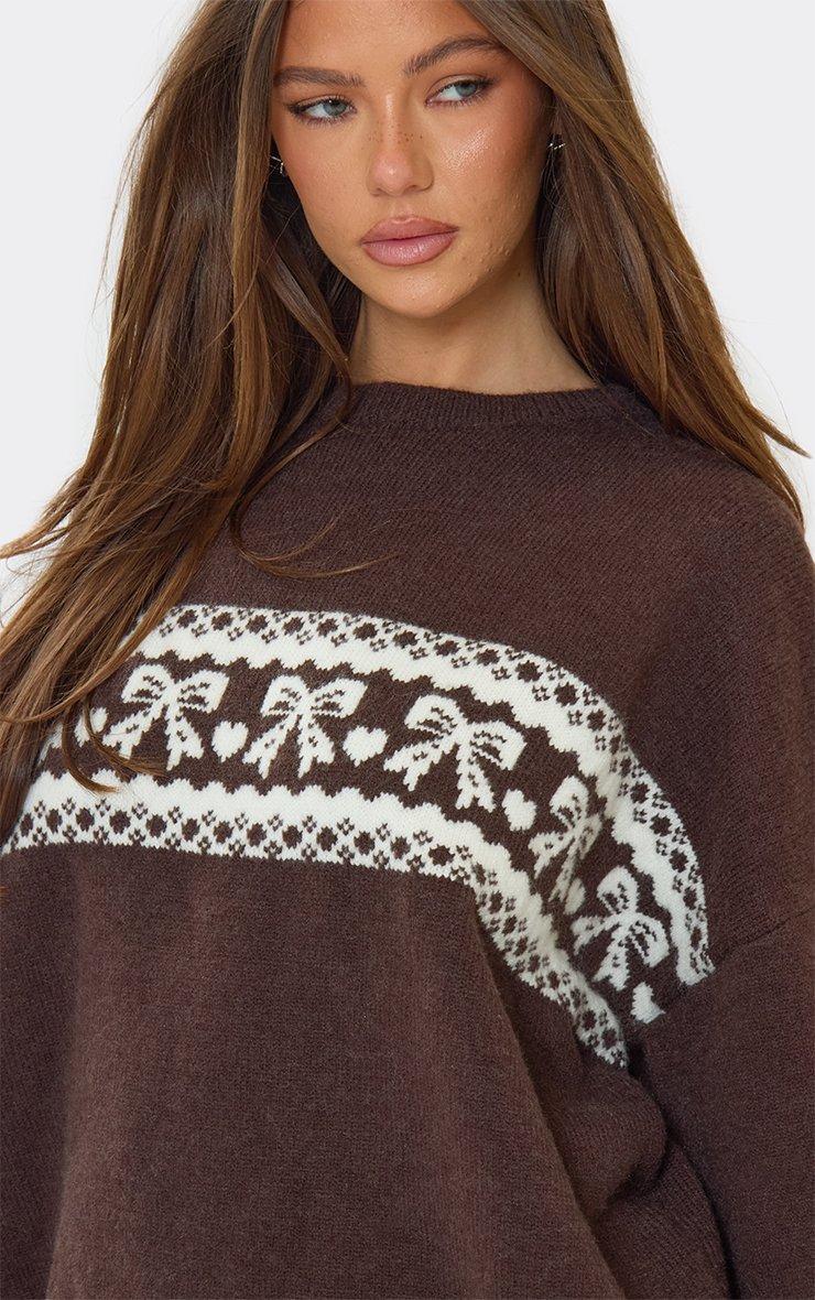 Long Sleeve Contrast Bow Fairisle Oversized Christmas Jumper In Brown Knit