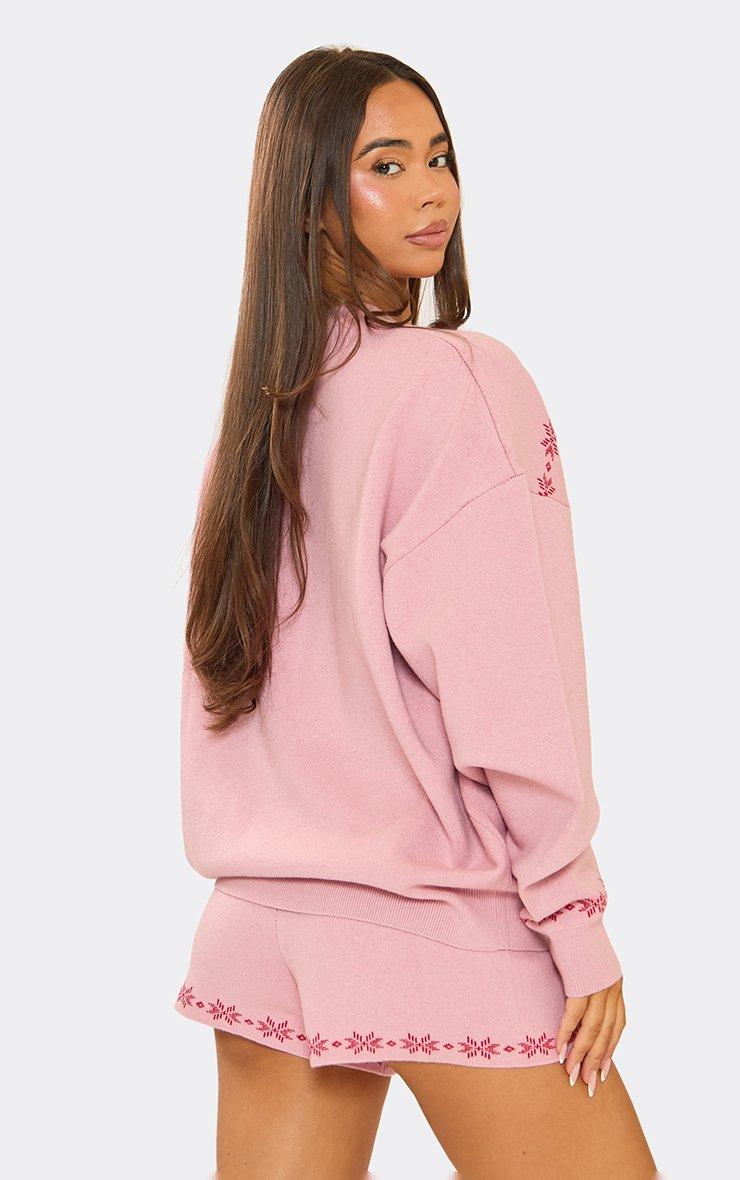 long sleeve reindeer fairisle graphic detail oversized christmas jumper in pink knit