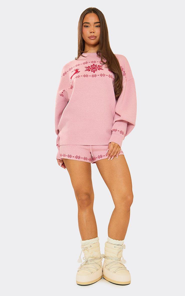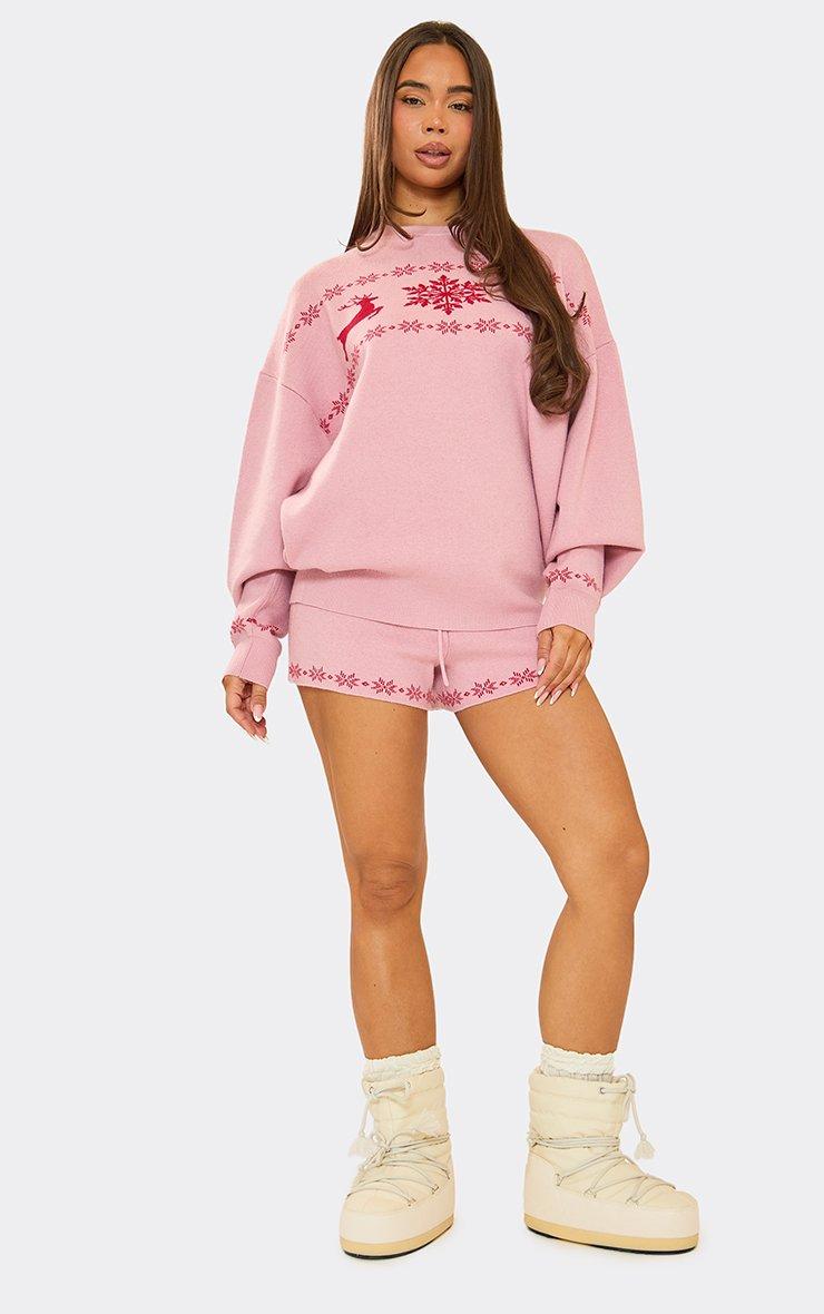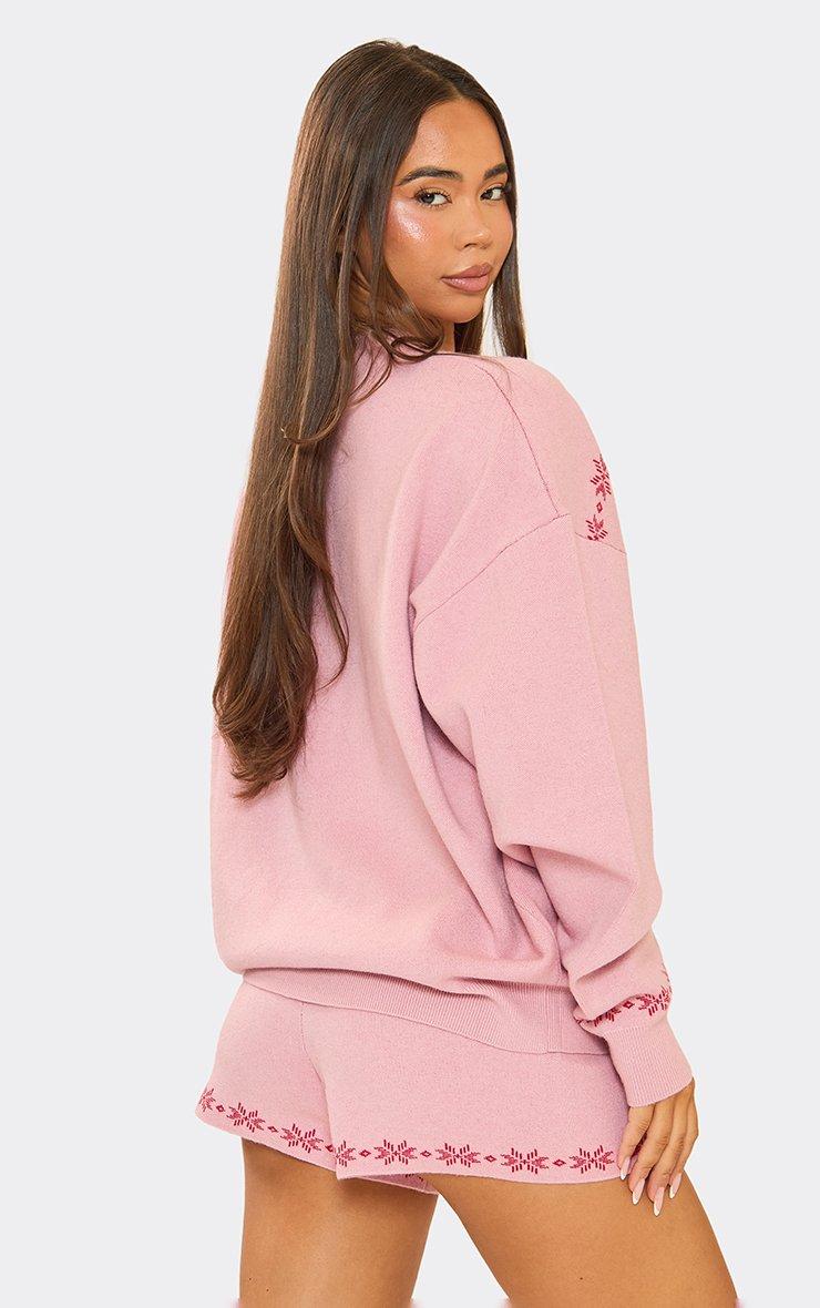 Long Sleeve Bow Graphic Detail Oversized Jumper In Pink Fluffy Knit