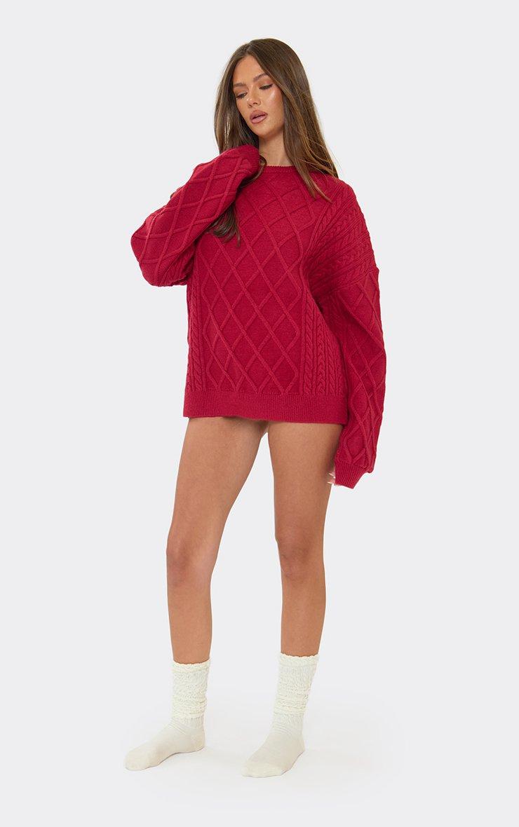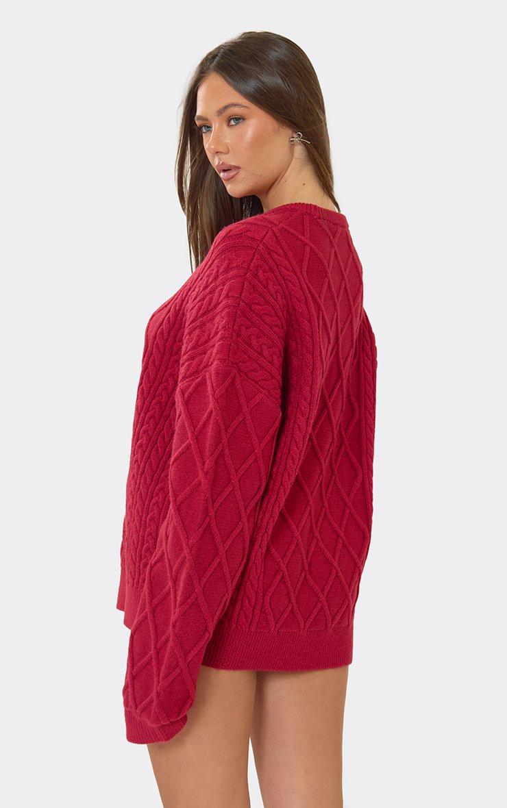 Long Sleeve Oversized Jumper In Burgundy Cable Knit