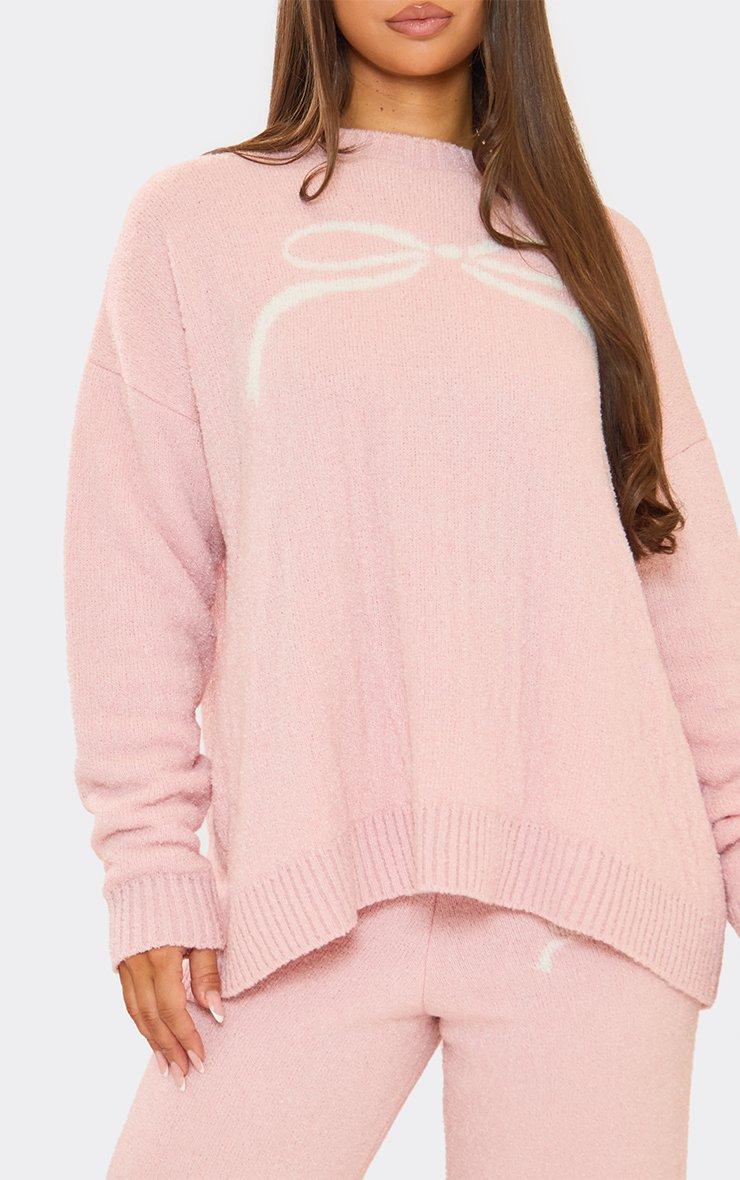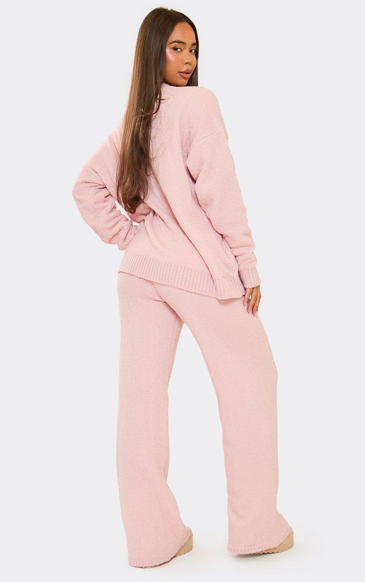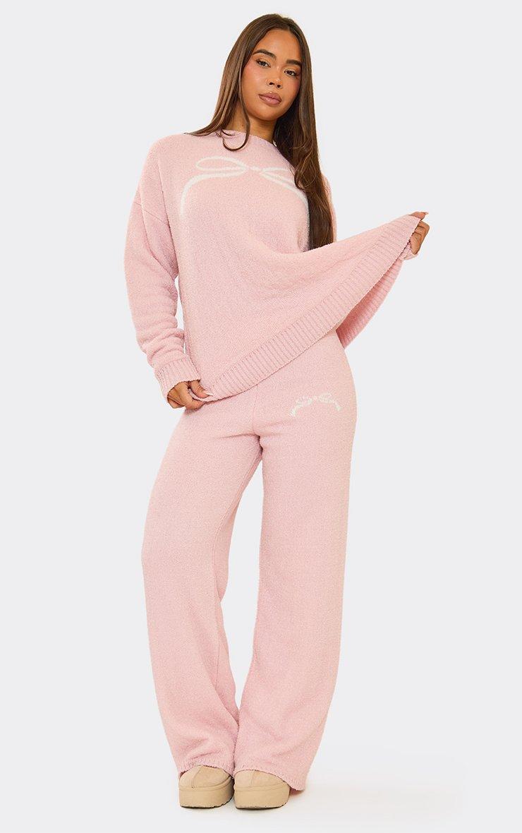 Bow Graphic Detail Wide Leg Trousers In Pink Fluffy Knit