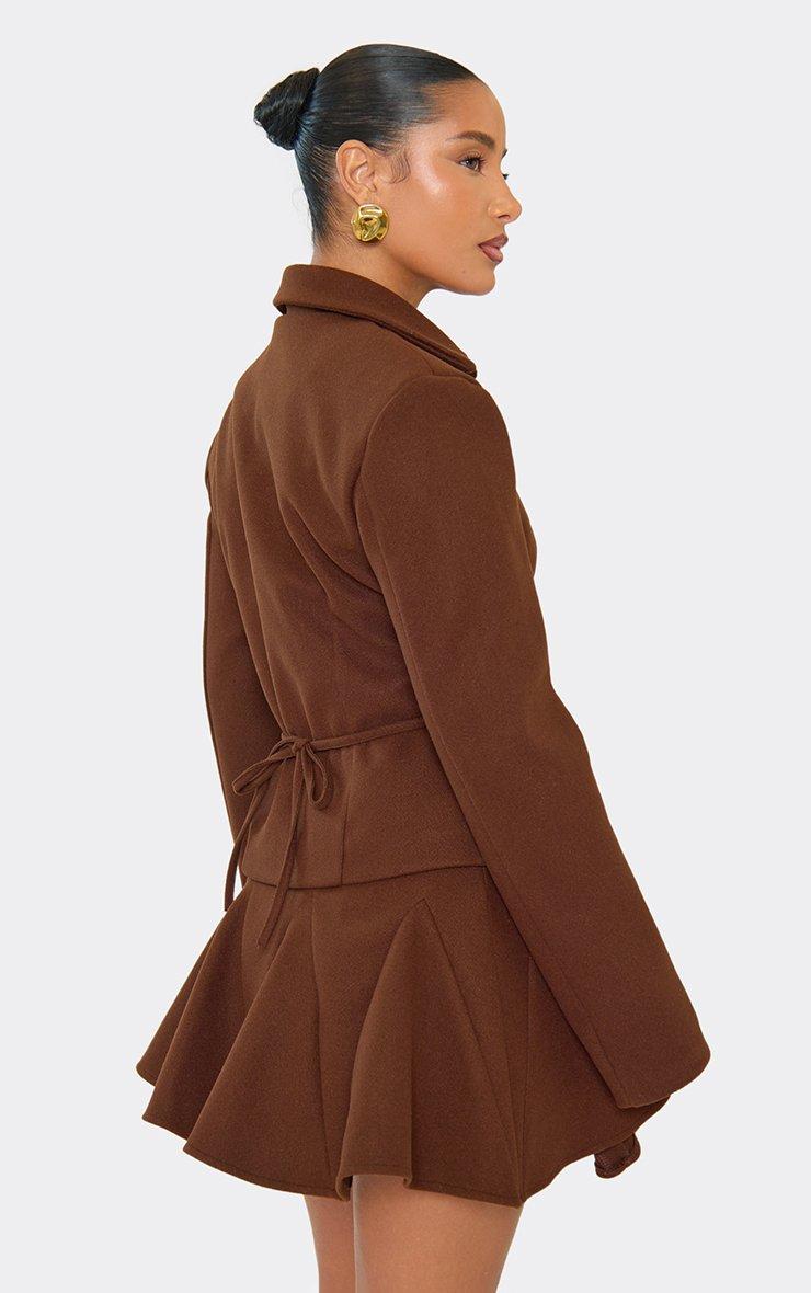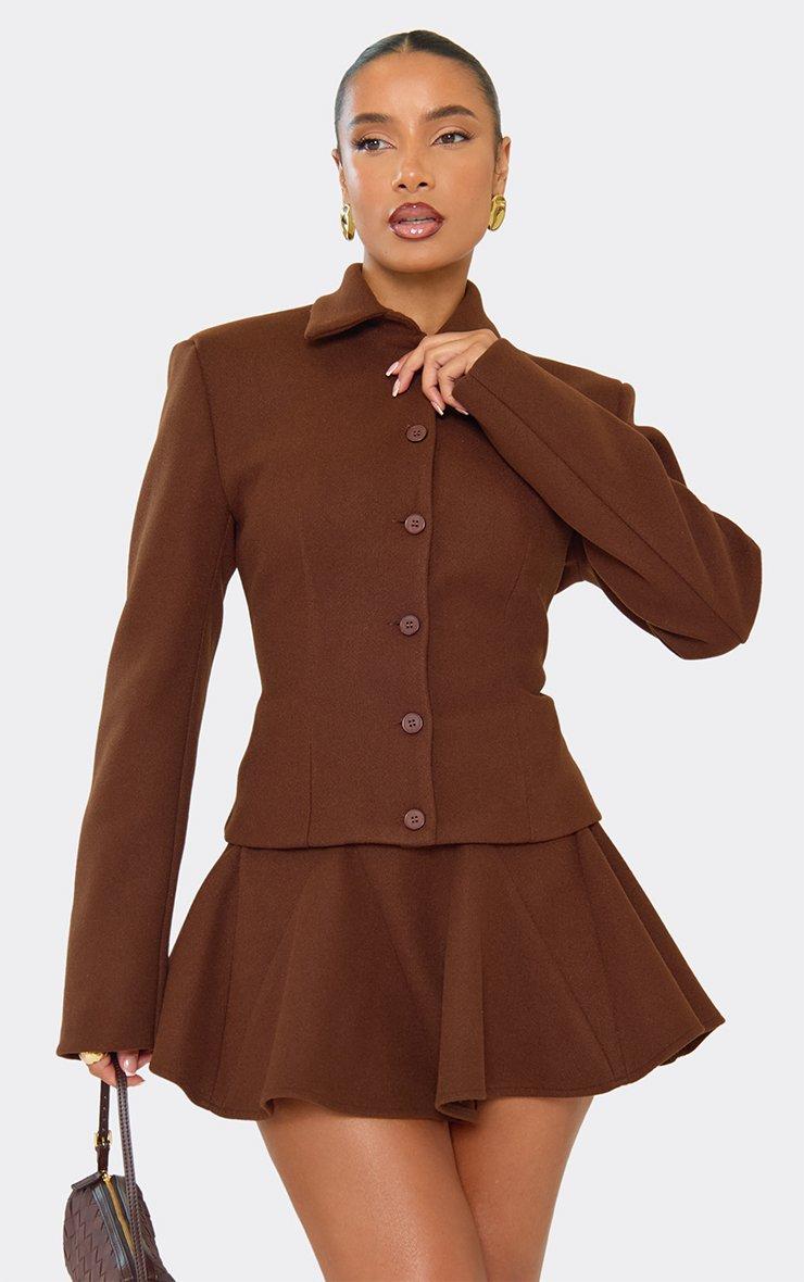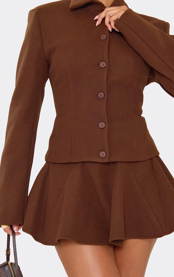 Shoulder Pad Cinched Waist Button Up Wool Look Top In Chocolate Brown
