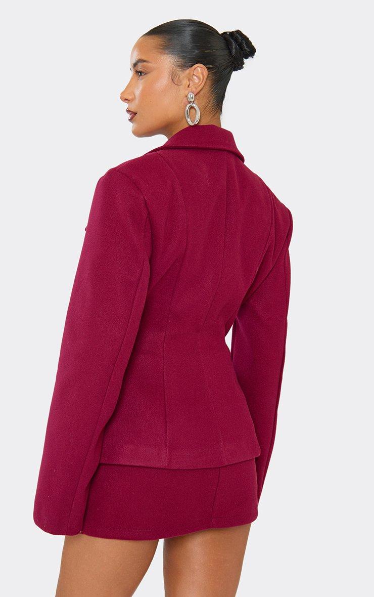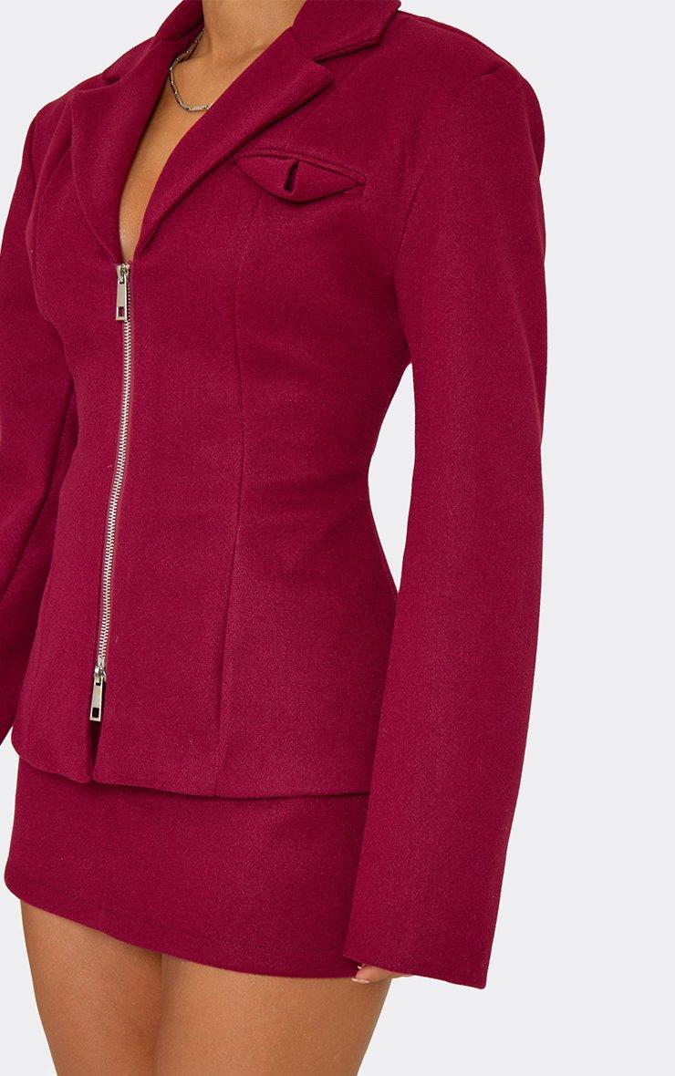 Double Zip Front Cinched Waist Wool Look Blazer In Burgundy