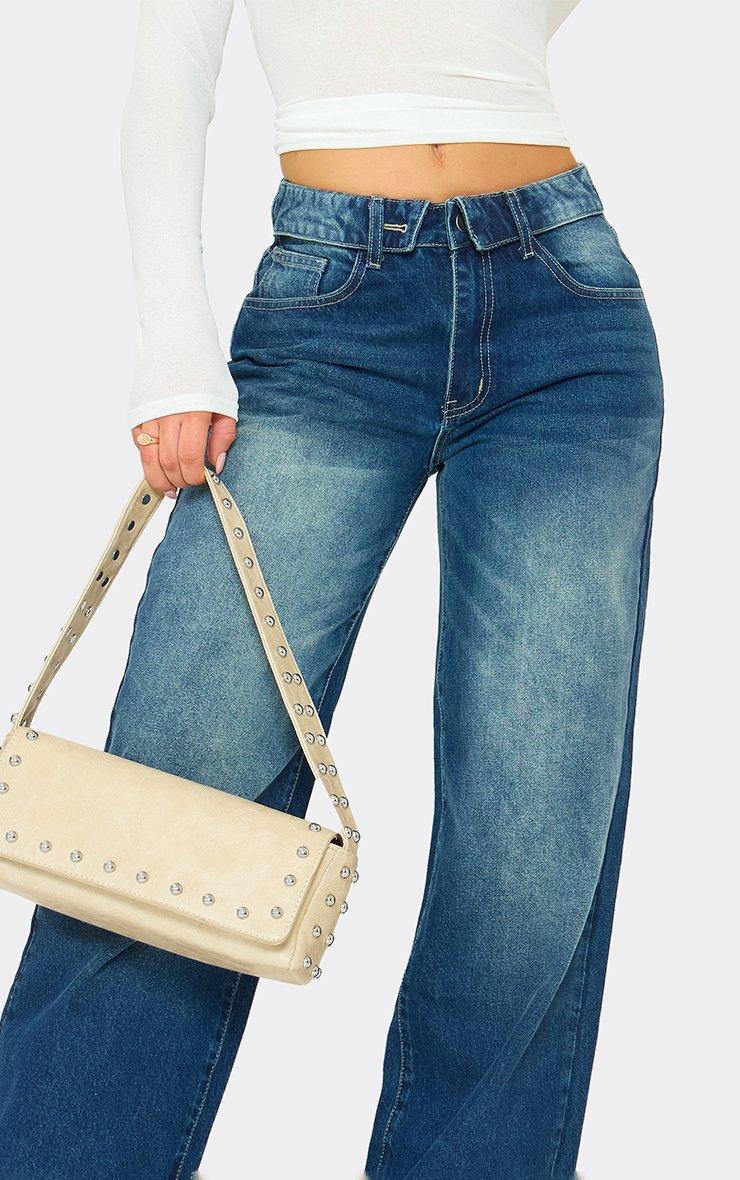 Low Rise Eyelet Detail Straight Leg Jeans In Vintage Wash Denim