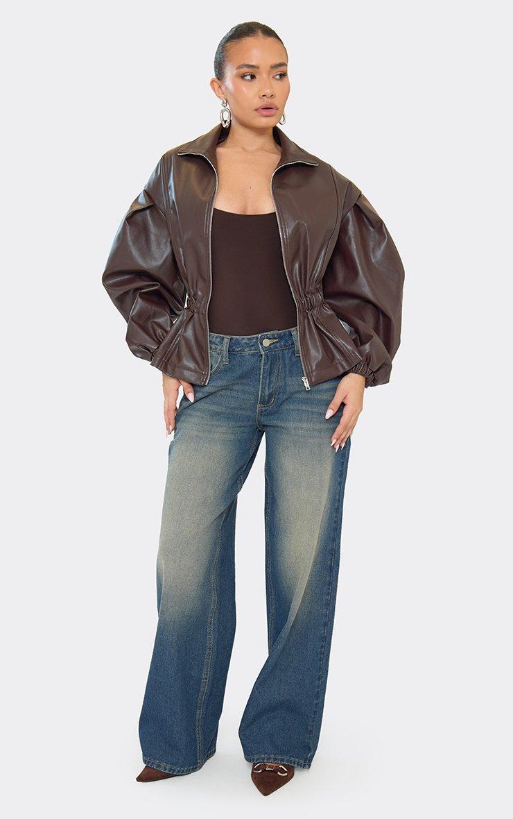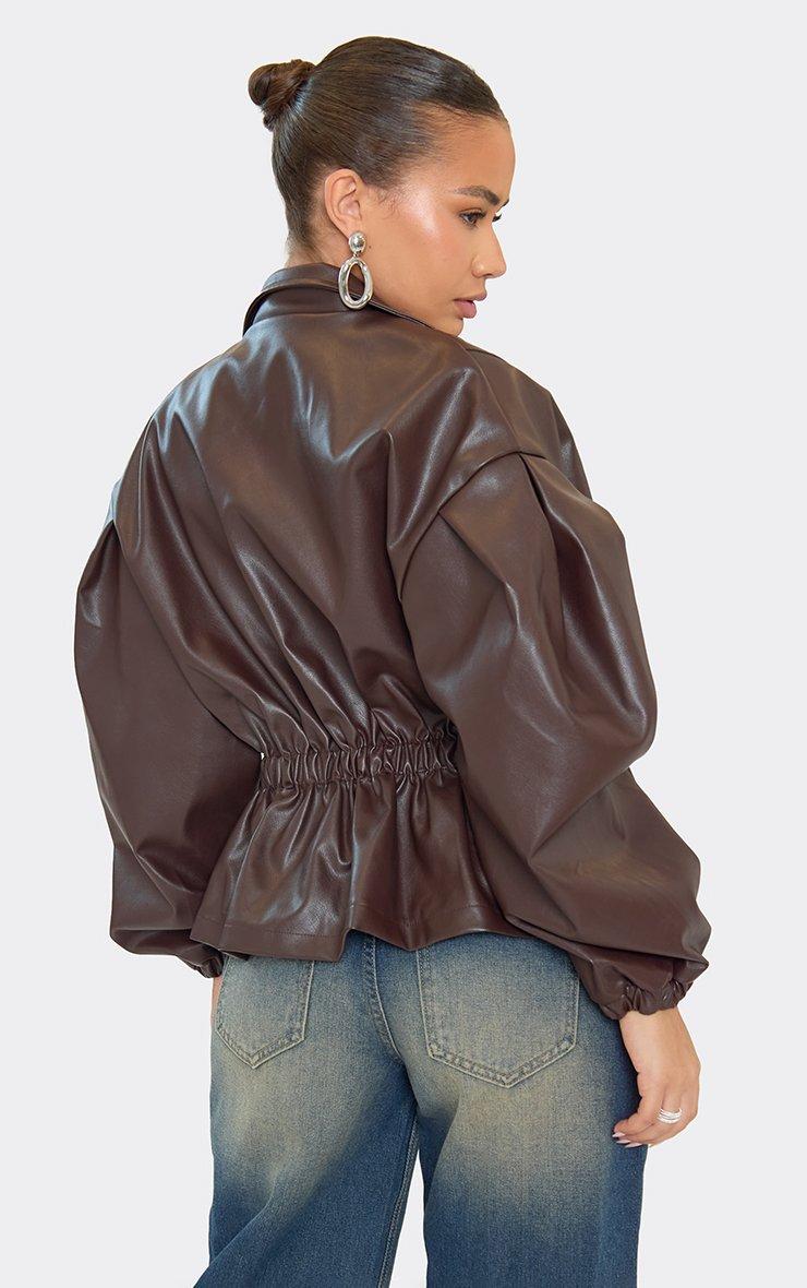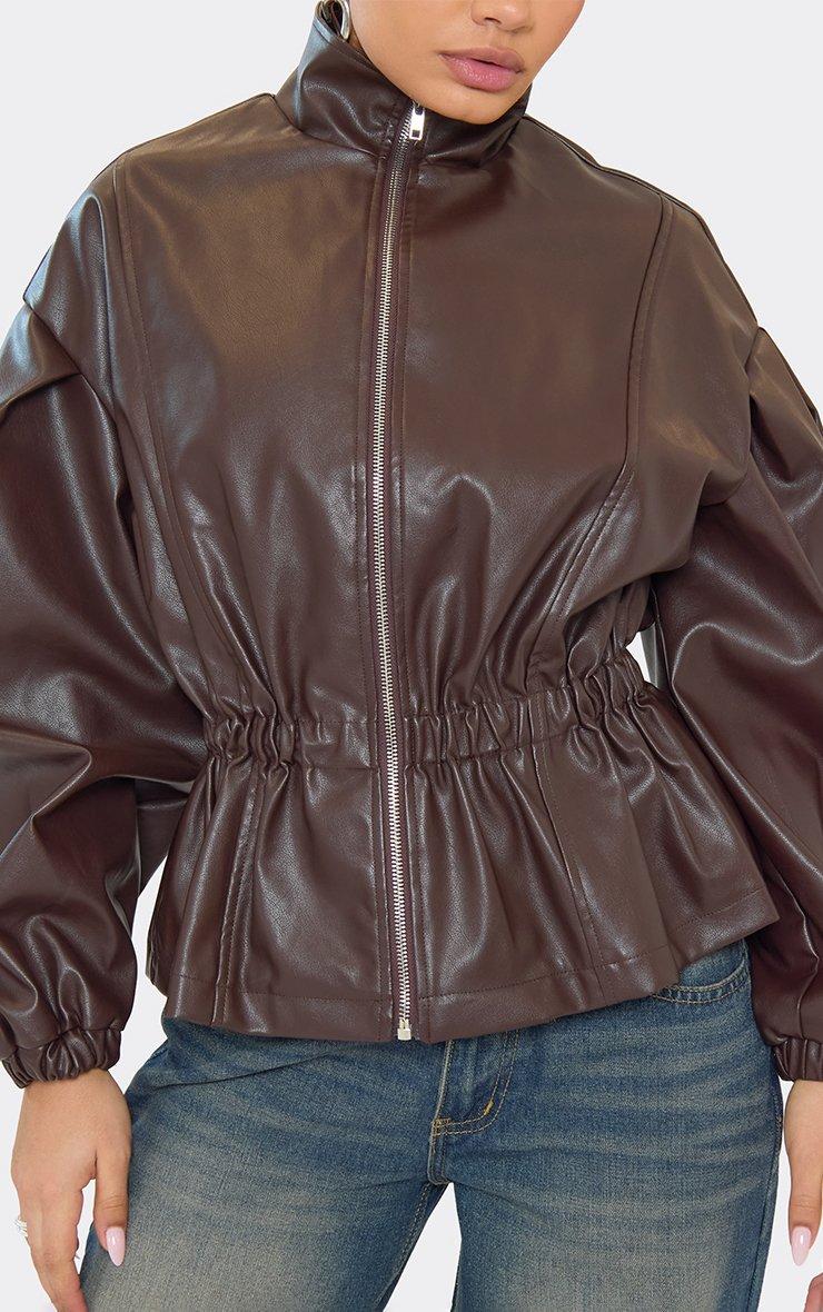 long sleeve high neck cinched elasticated waist jacket in chocolate brown faux leather