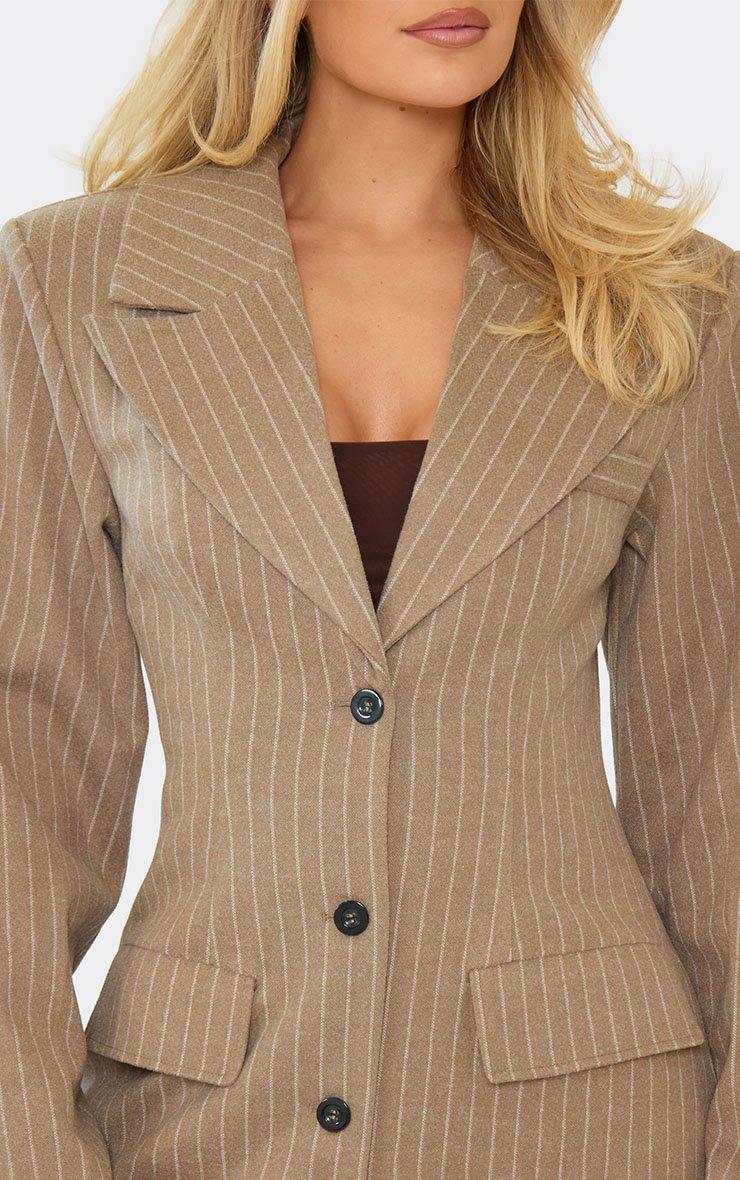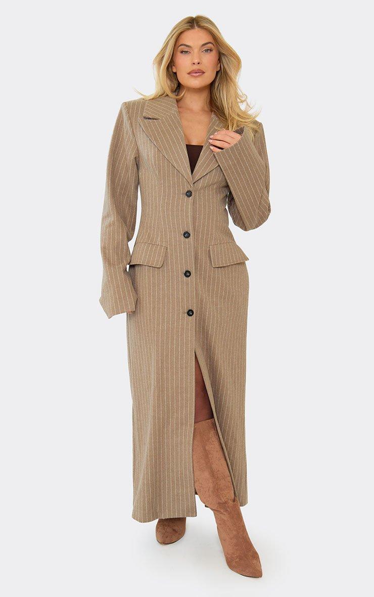 Cinched Waist Wool Look Maxi Coat In Stone Pinstripe