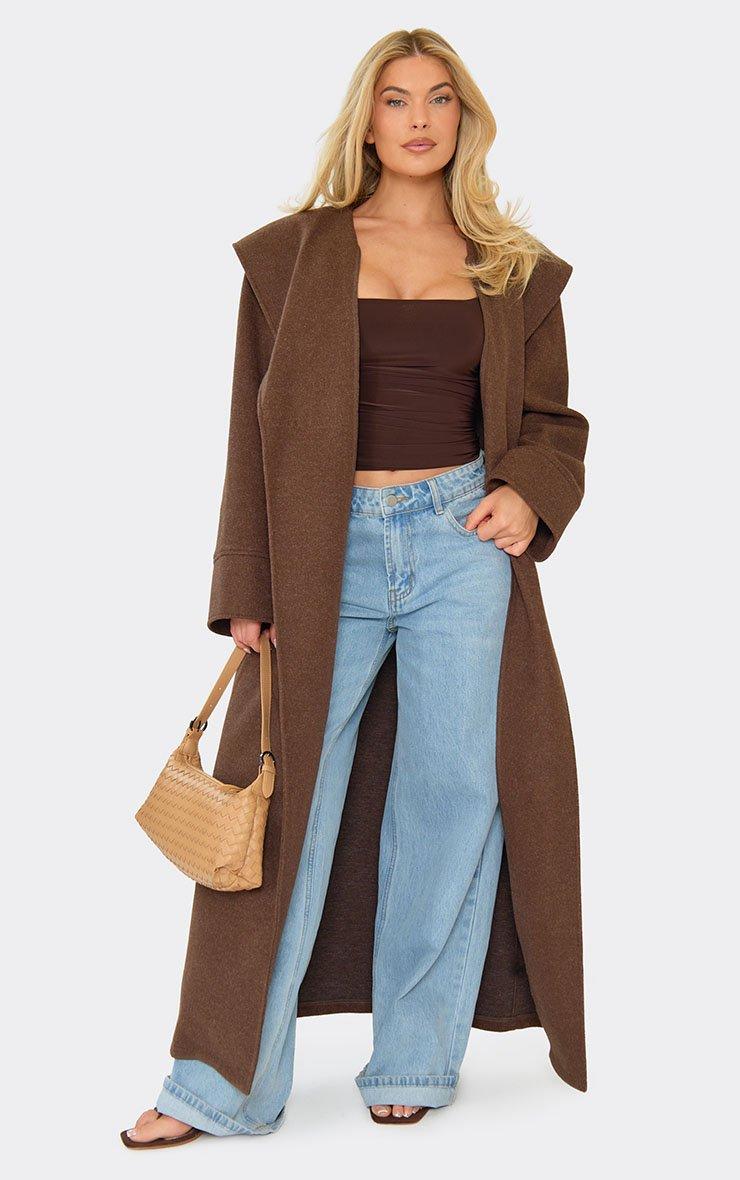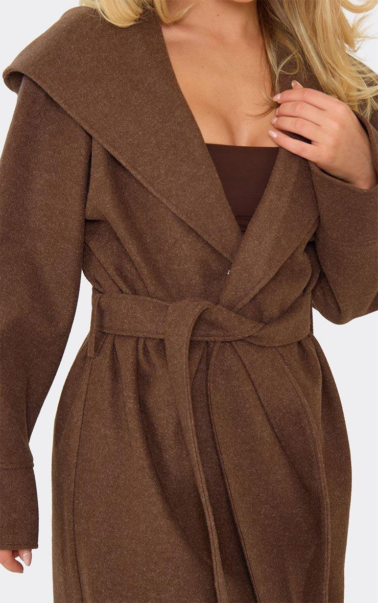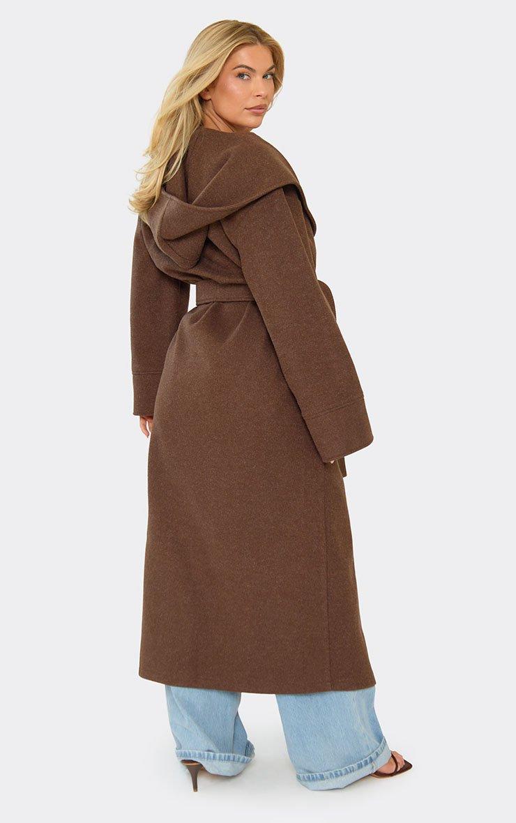 Hooded Tie Waist Wool Look Maxi Coat In Chocolate Brown