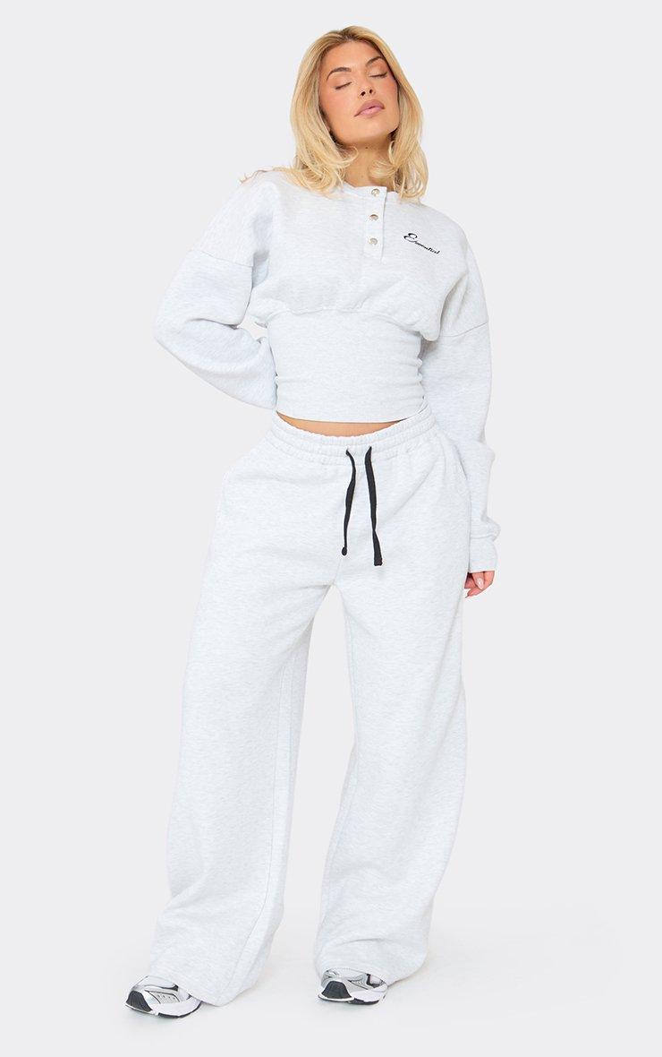 Low Rise Wide Leg Essential Embroidered Graphic Joggers In Light Grey Marl