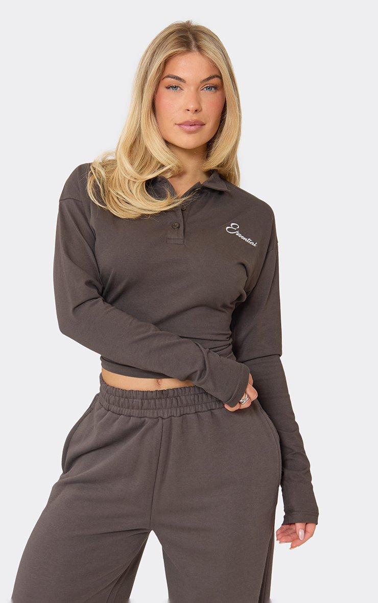 long sleeve essential embroidered graphic button detail top in chocolate brown
