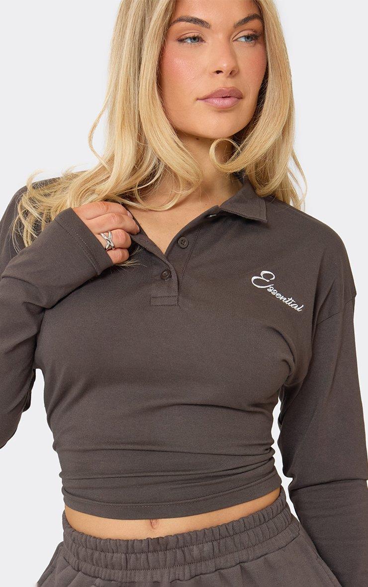 Long Sleeve Essential Embroidered Graphic Button Detail Top In Chocolate Brown