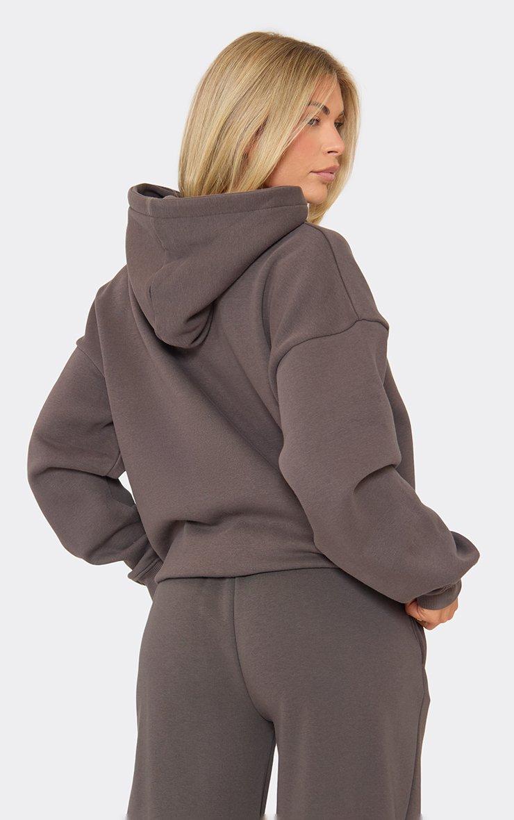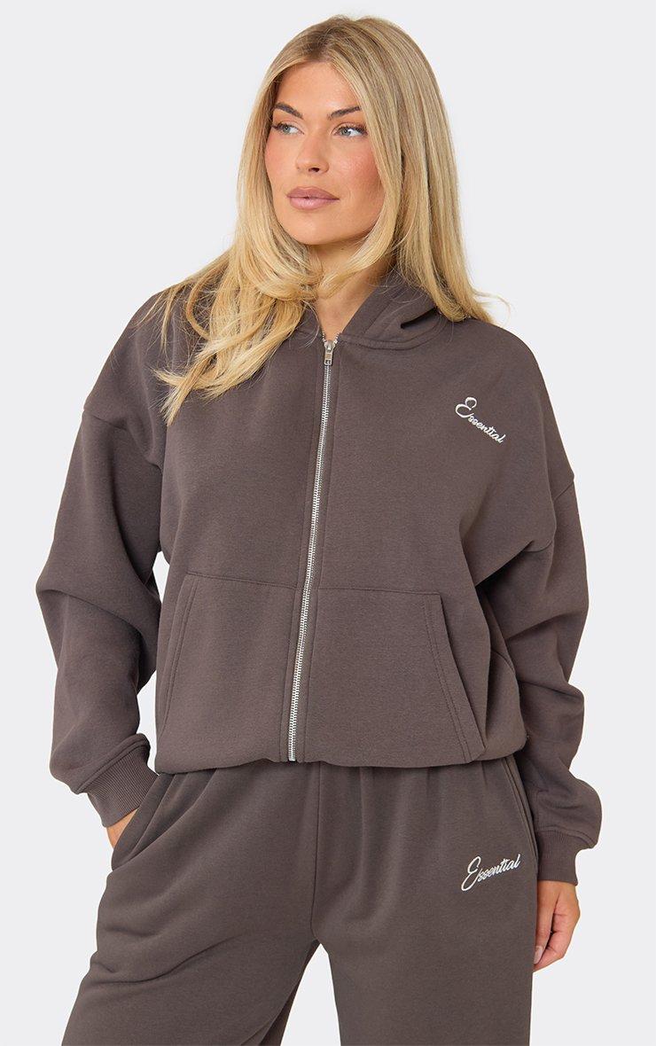 boxy oversized essential graphic zip up hoodie in chocolate brown