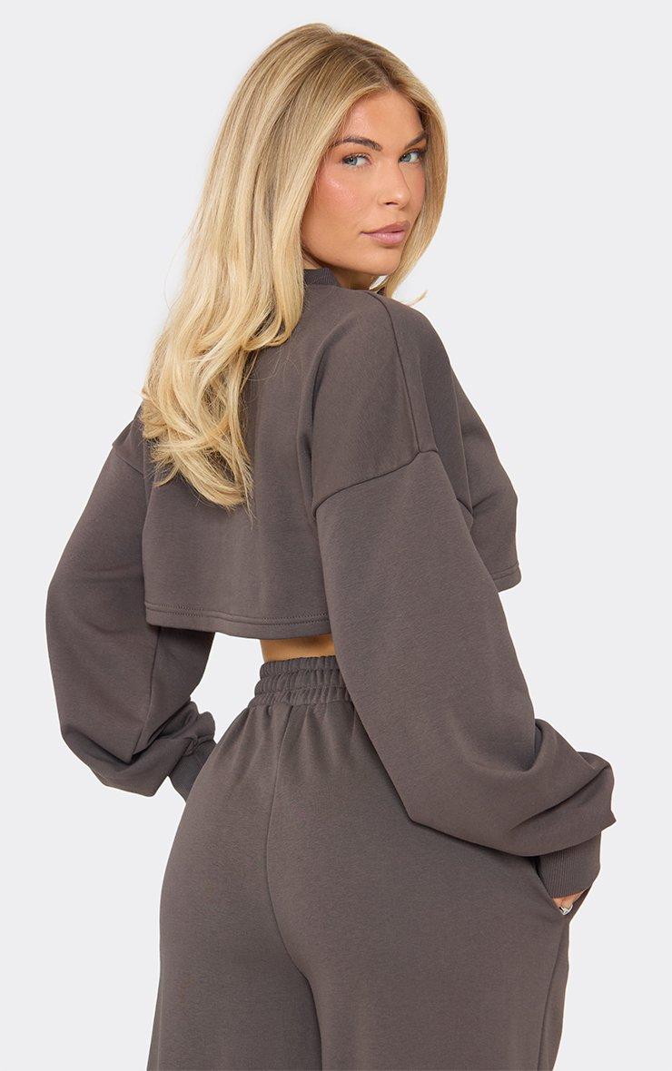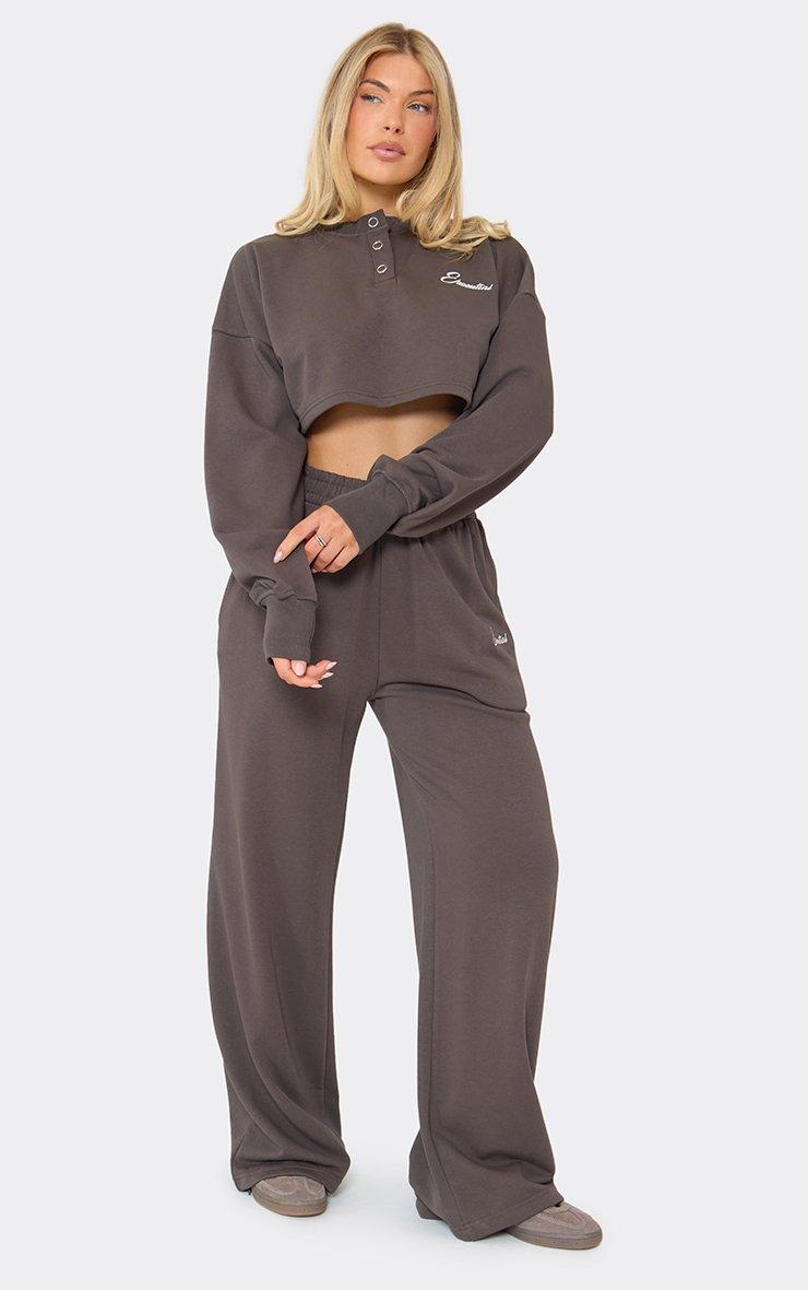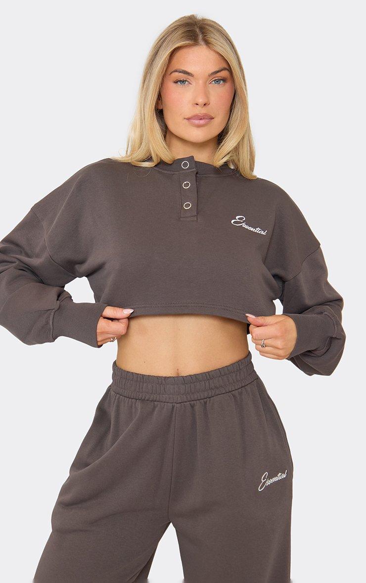 Essential Embroidered Graphic Popper Cropped Sweatshirt In Chocolate Brown