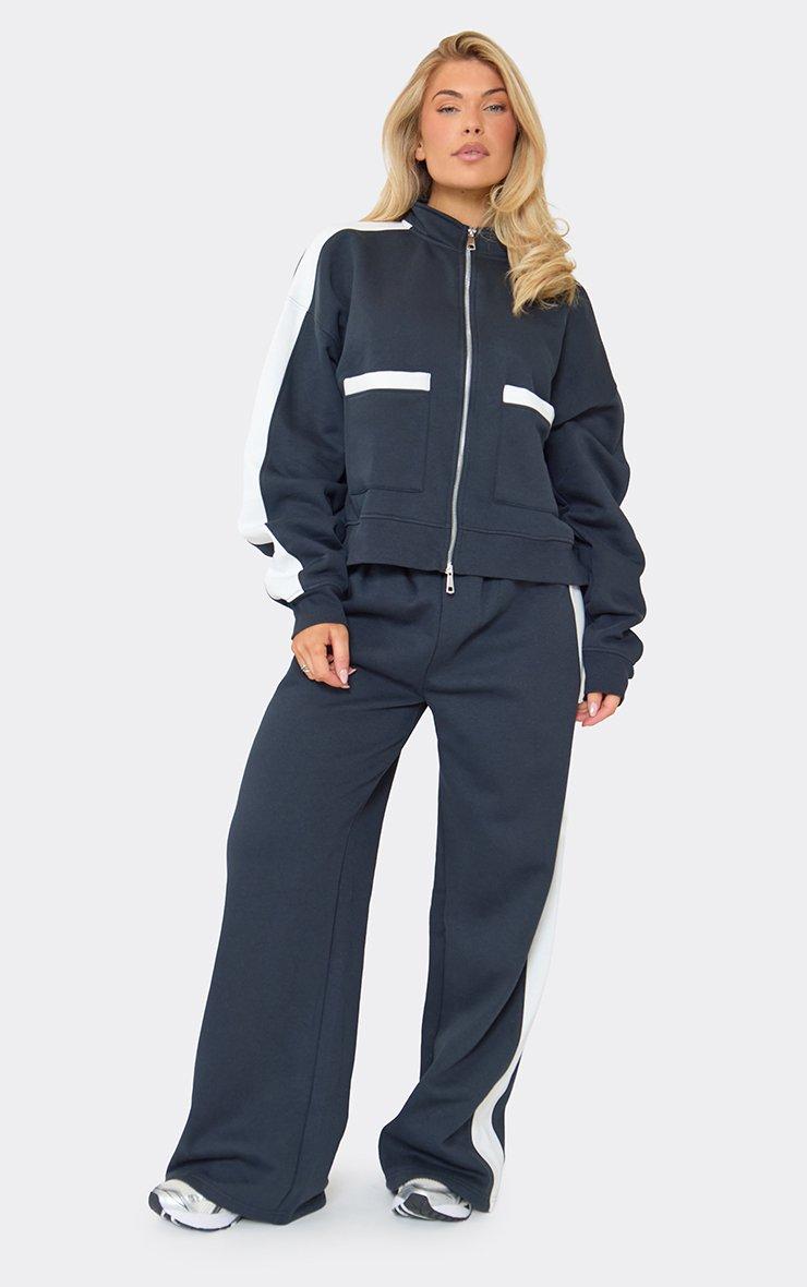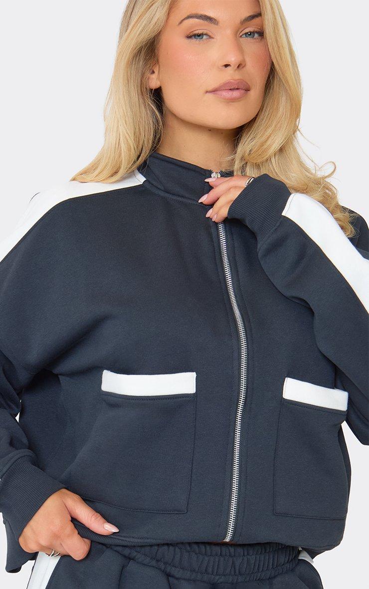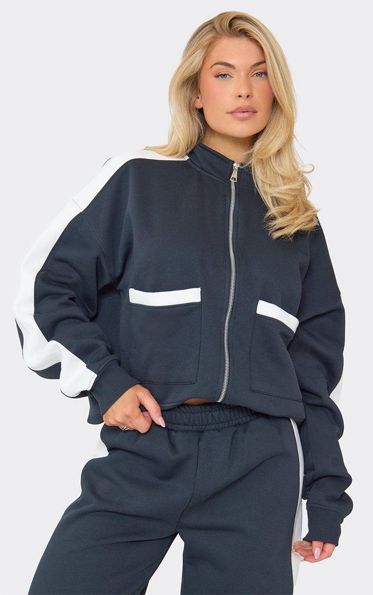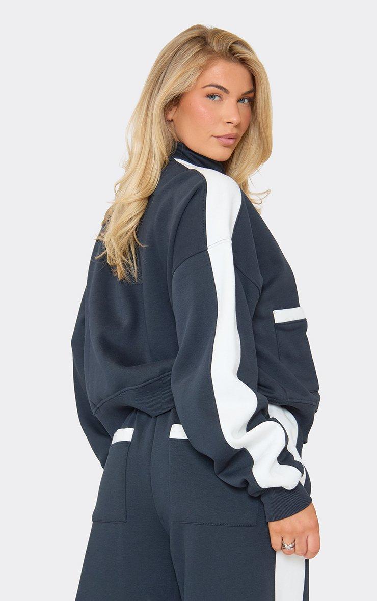Contrast Panel Pocket Detail Boxy Zip Up Sweatshirt In Navy
