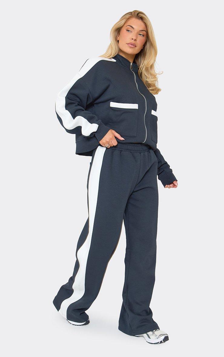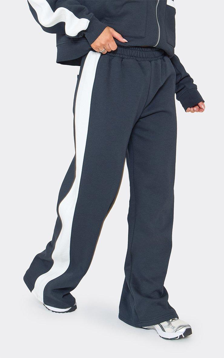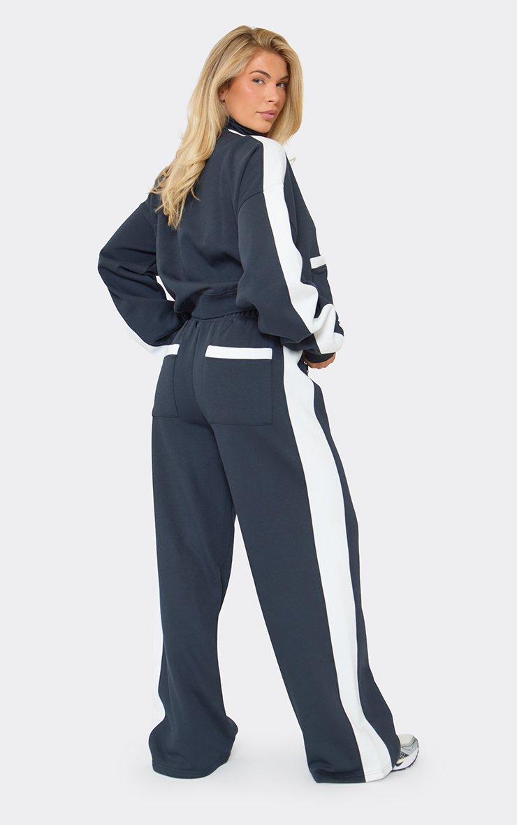 Mid Rise Contrast Piping Detail Wide Leg Joggers In Dark Navy Blue