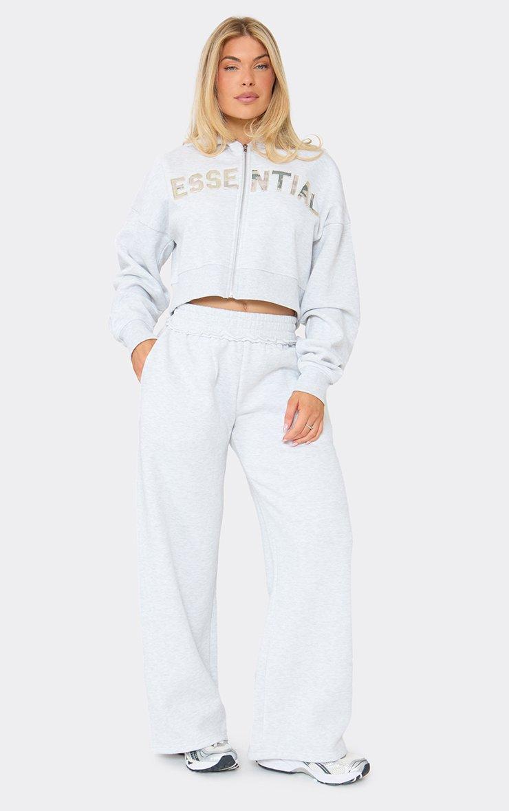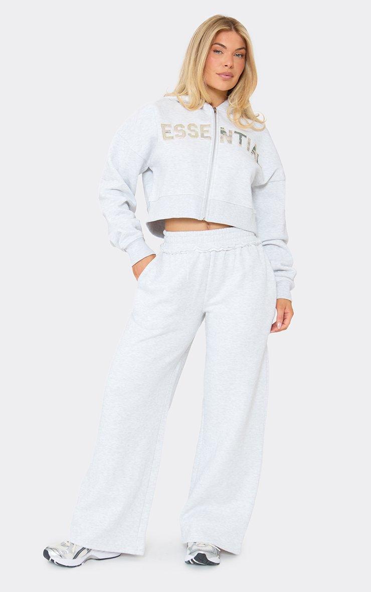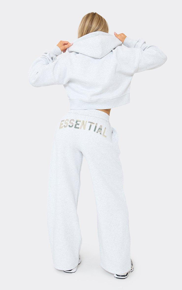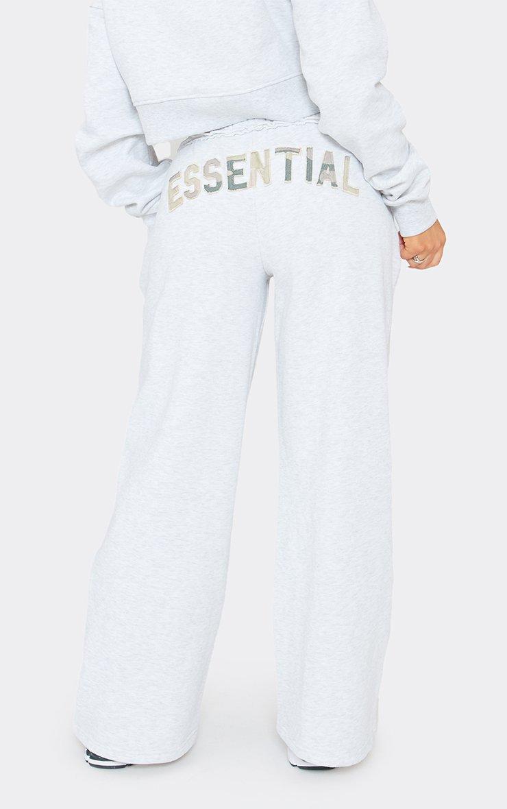 mid rise essential camo printed graphic wide leg joggers in light grey marl