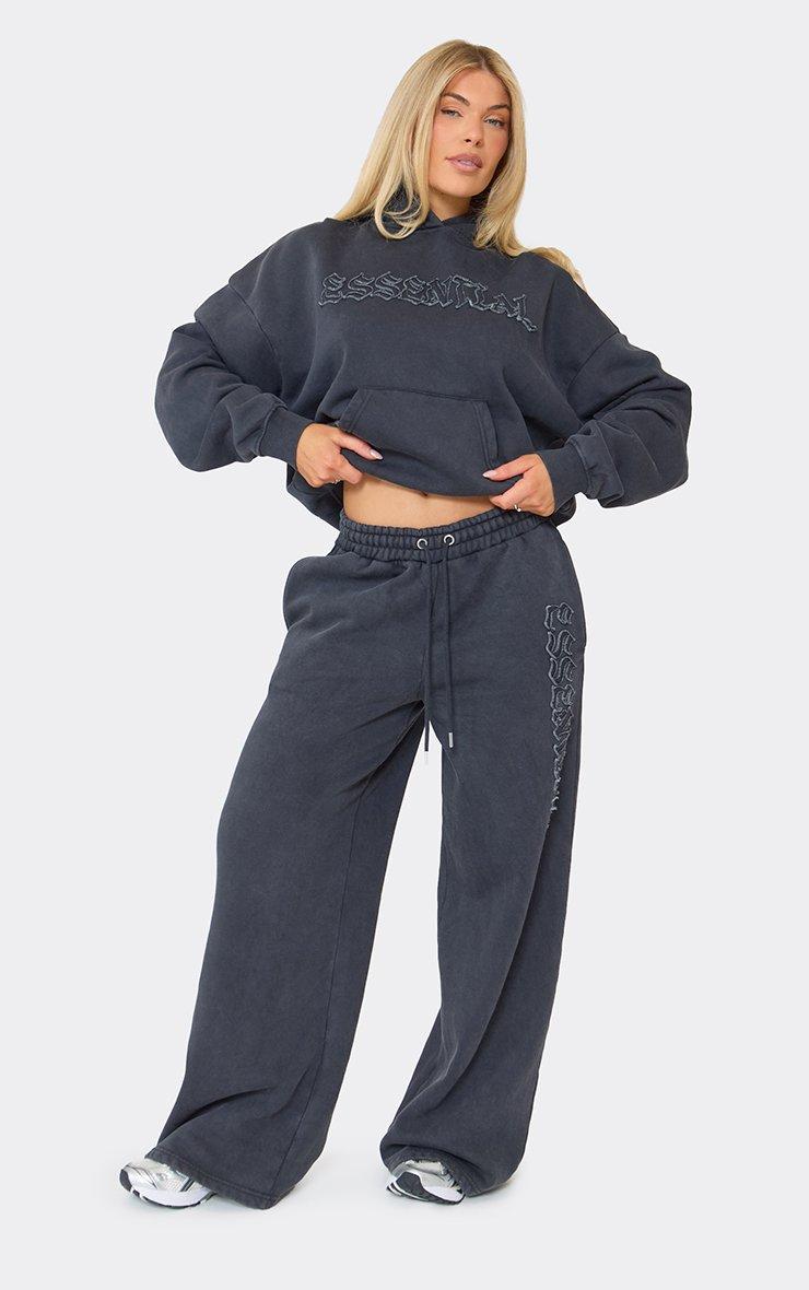 long sleeve embroidered essential graphic hoodie in washed charcoal grey
