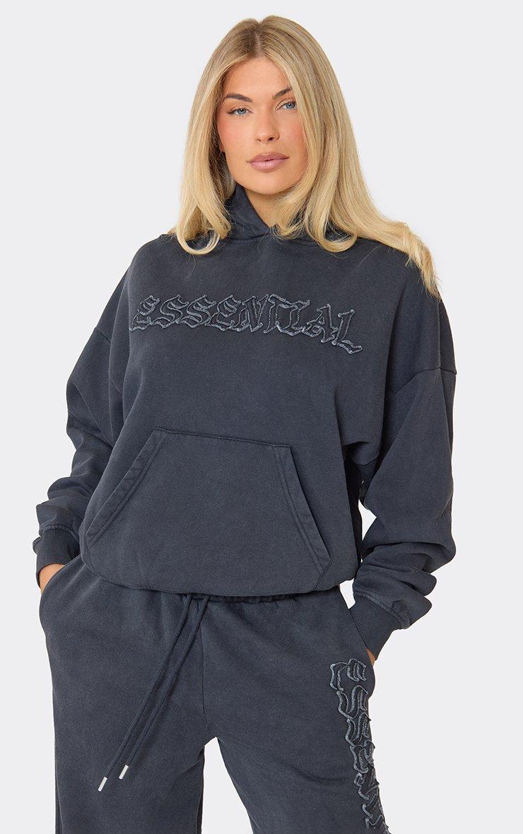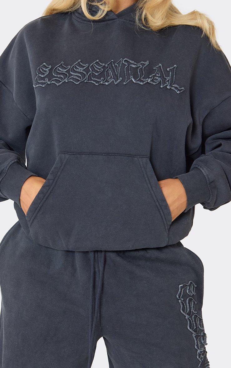 Long Sleeve Embroidered Essential Graphic Hoodie In Washed Charcoal Grey