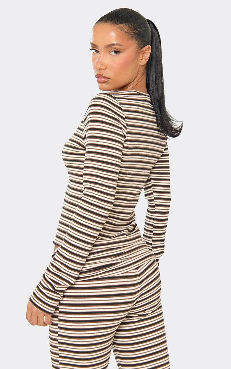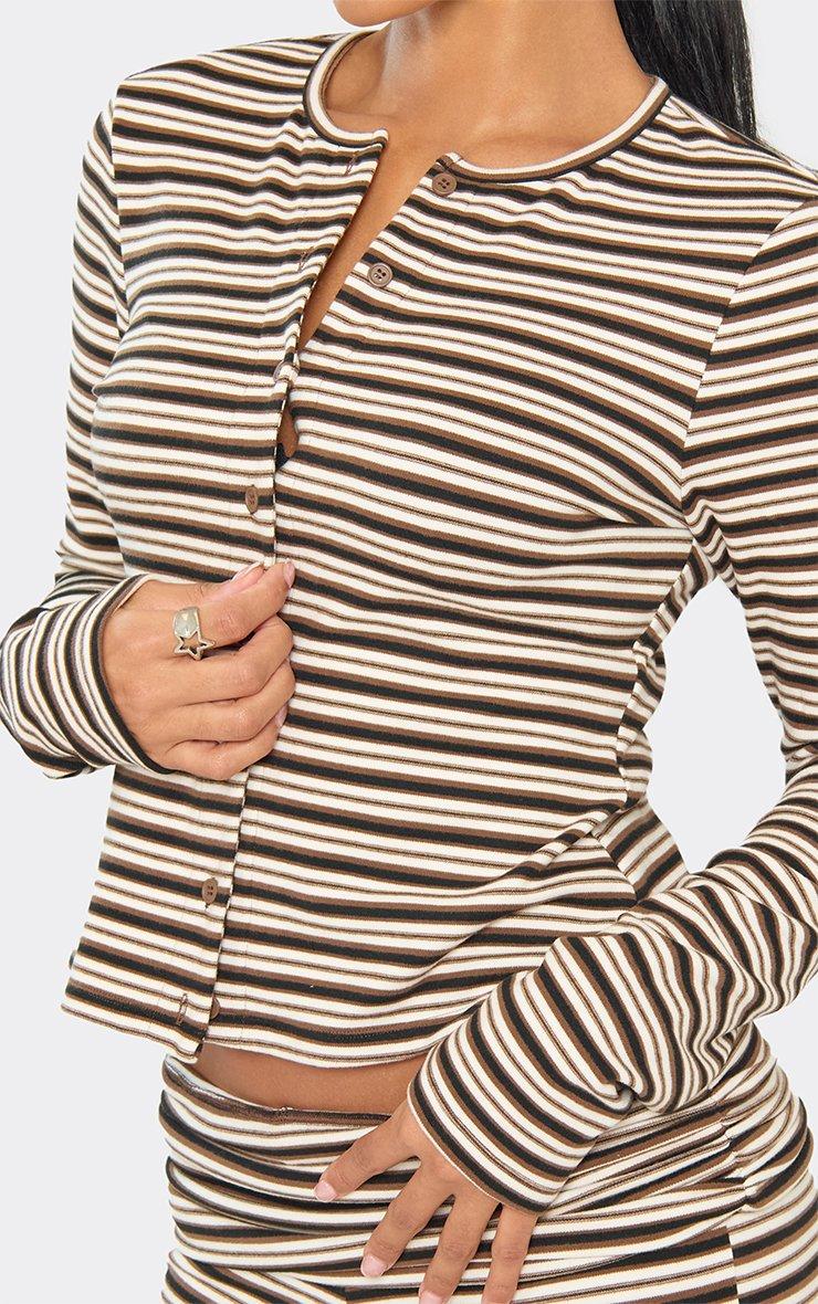 Long Sleeve Button Front Fitted Top In Chocolate Brown Ribbed