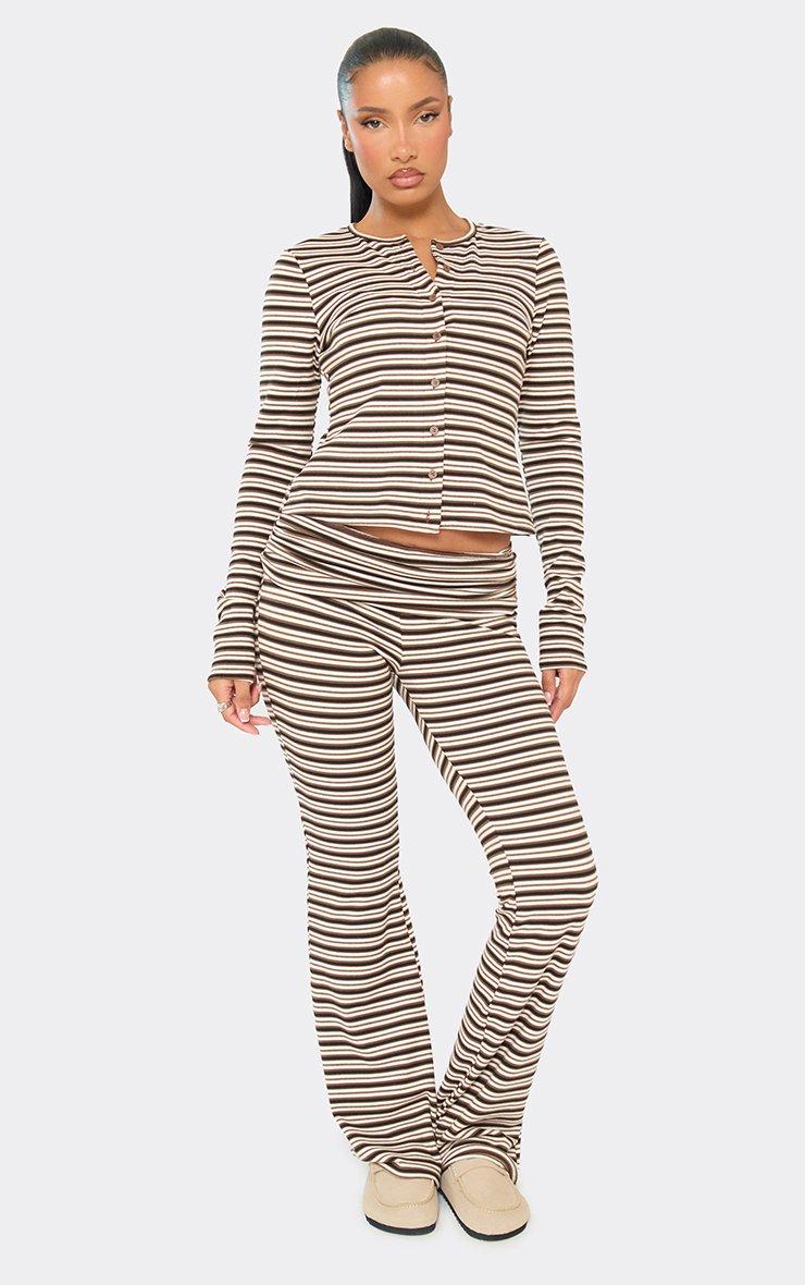 Low Rise Fold Over Flared Trousers In Brown Striped Soft Fleece