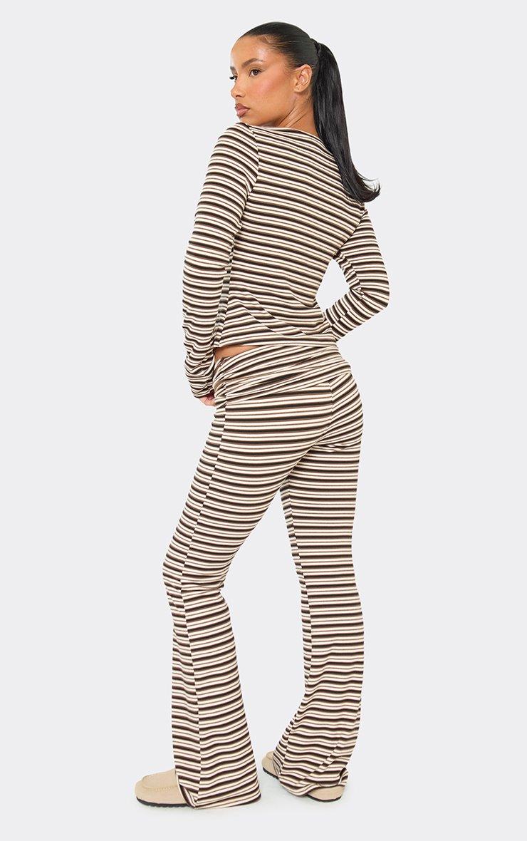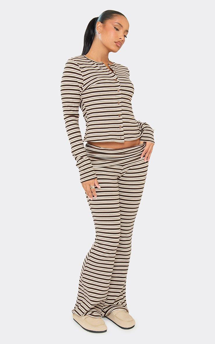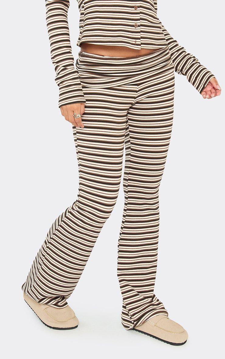 Low Rise Fold Over Flared Trousers In Brown Striped Soft Fleece