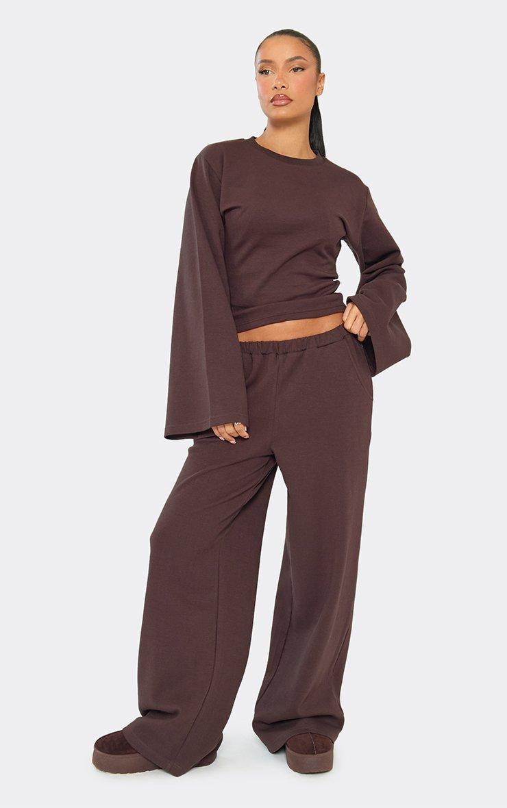 Low Rise Wide Leg Detail Joggers In Chocolate