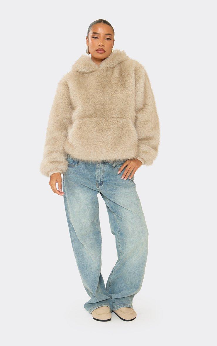 Long Sleeve Pocket Front Hoodie In Cream Faux Fur