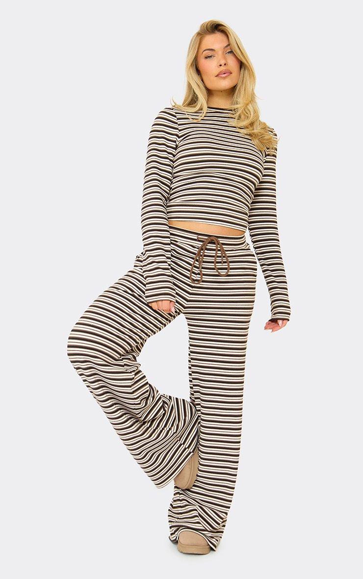 Long Sleeve Fitted Top In Brown Soft Stripe Fleece