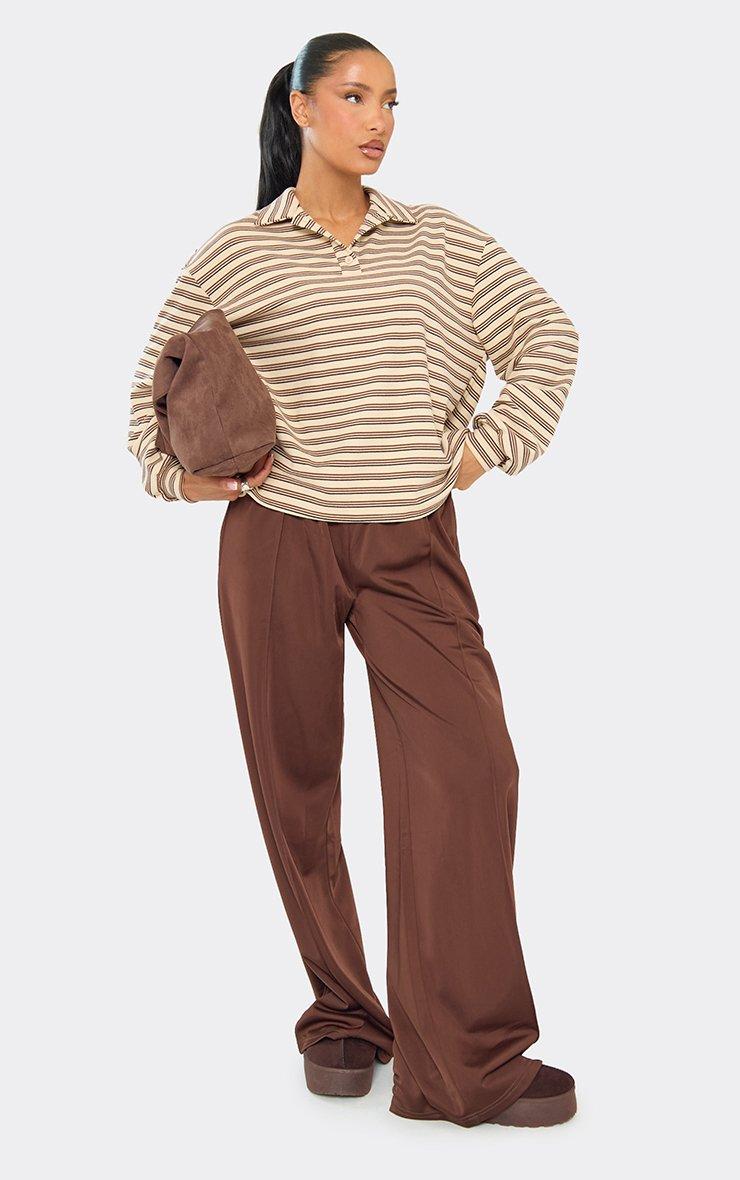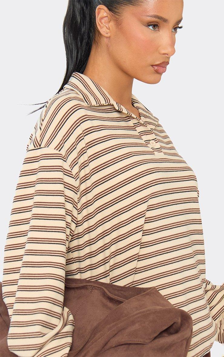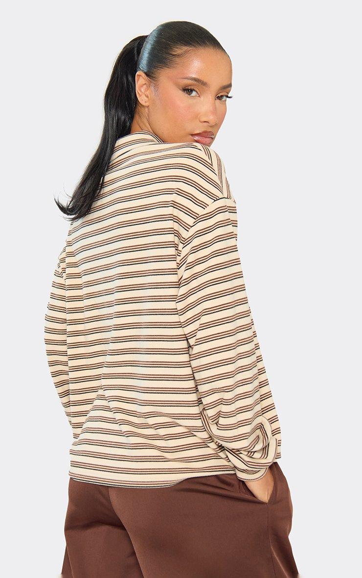 Long Sleeve Collar Detail Top In Cream Stripe Soft Fleece