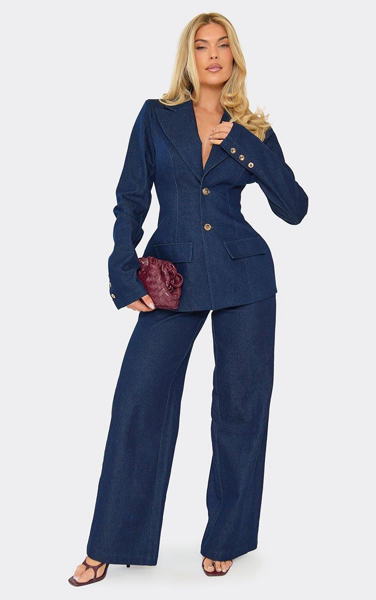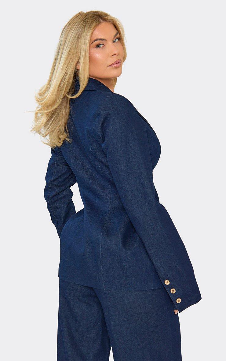 Long Sleeve Cinched Waist Shaped Hip Detail Blazer In Indigo Blue Denim