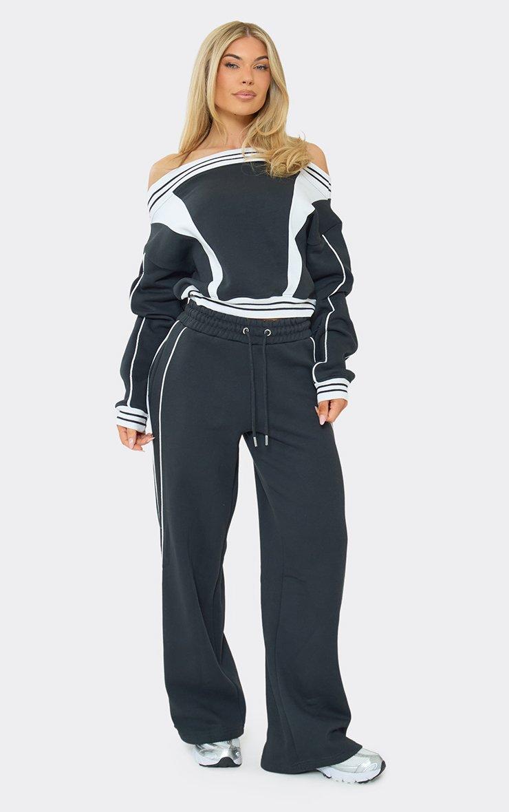 Off The Shoulder Contrast Stripe Cinched Waist Detail Sweatshirt In Navy Blue