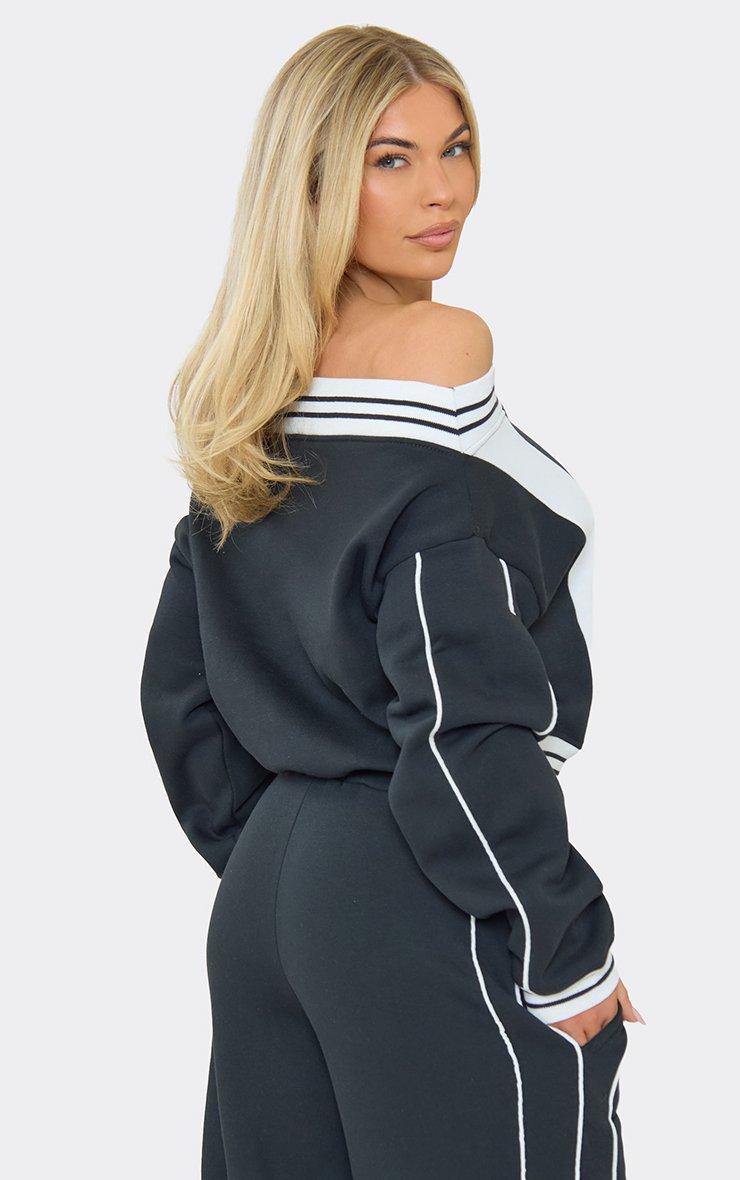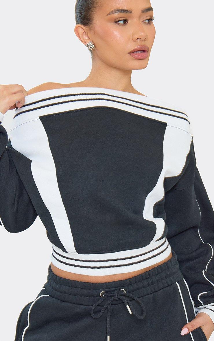 off the shoulder contrast stripe cinched waist detail sweatshirt in navy blue