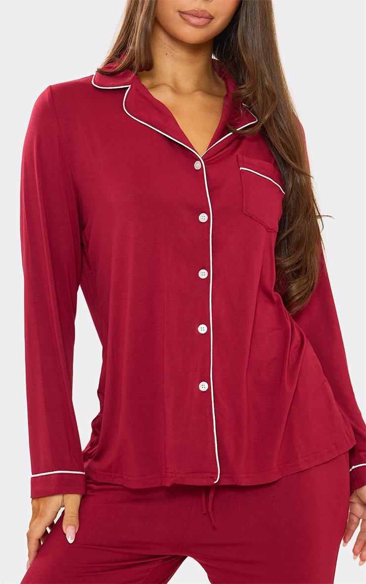 long sleeve piping detail button front top and trouser pyjama set in burgundy jersey