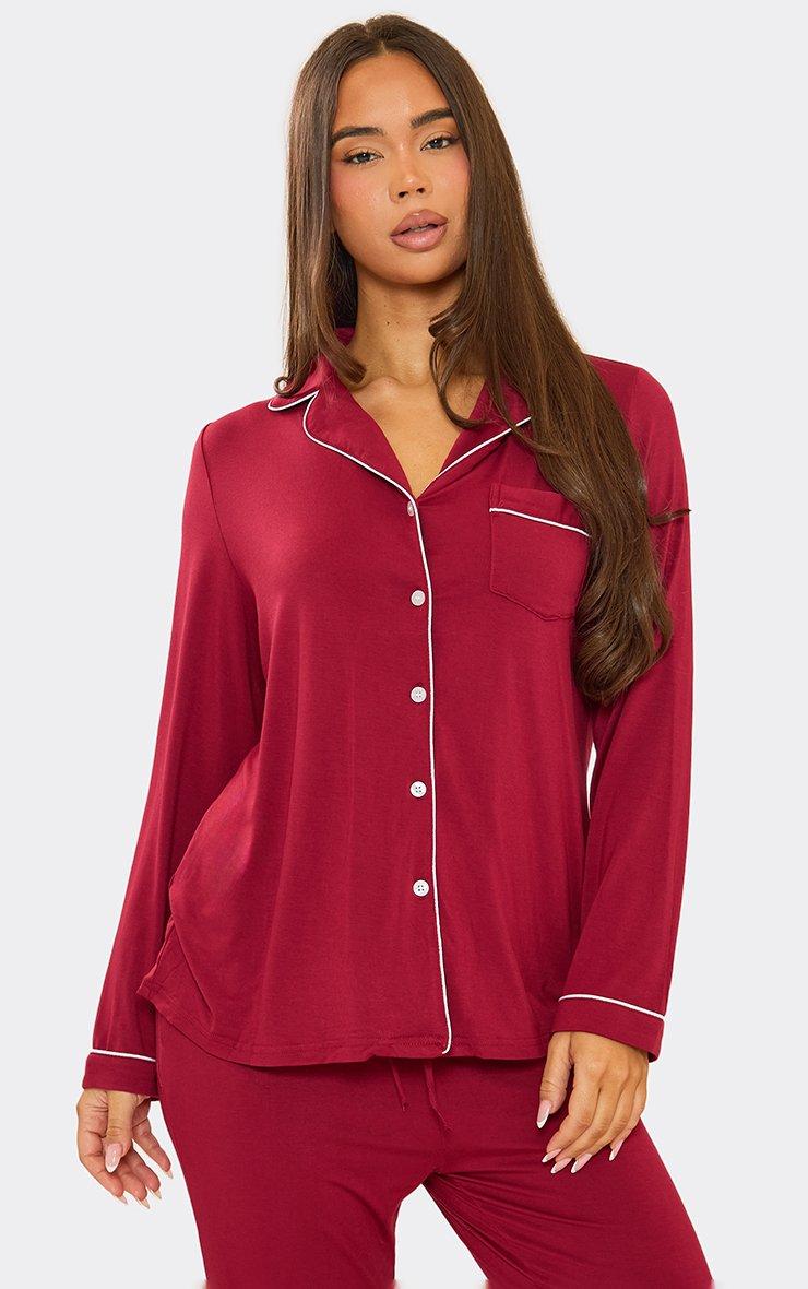 Long Sleeve Piping Detail Button Front Top And Trouser Pyjama Set In Burgundy Jersey
