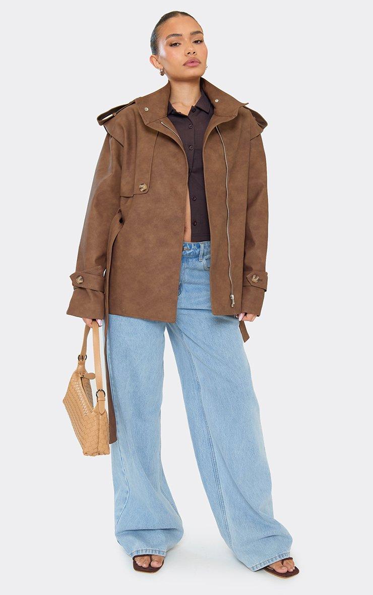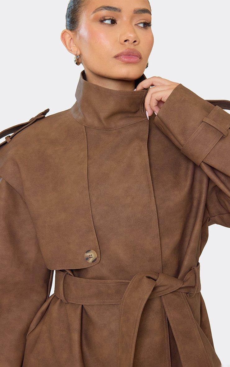 long sleeve funnel neck trench jacket in chocolate brown faux leather
