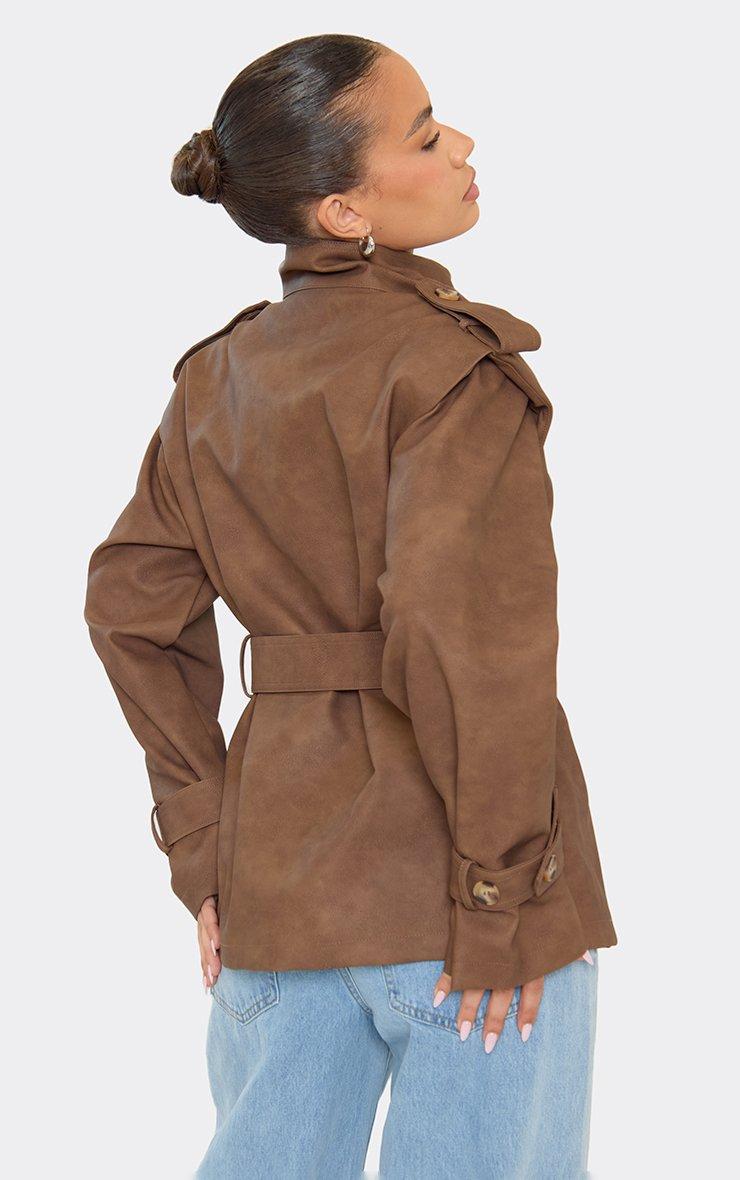 Long Sleeve High Neck Belted Jacket In Chocolate Brown Faux Leather