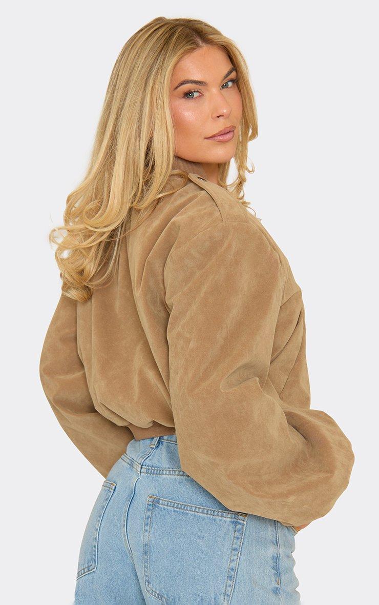 Long Sleeve Cropped Bomber Jacket In Light Brown Faux Suede