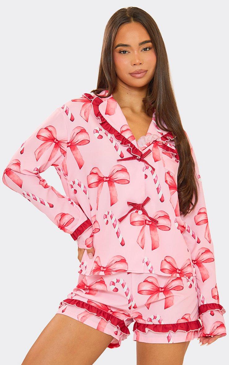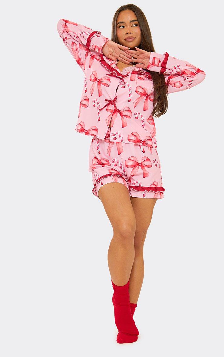 long sleeve bow print detail lace trim top and shorts pyjama set in pink